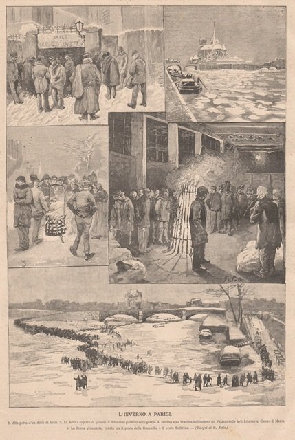 5 immagini invernali di Parigi: 1. Alla porta di un asilo di notte - 2. La Senna coperta di ghiacci - 3. I bracieri pubblici nelle piazze - 4. Intorno a un braciere nell’interno del Palazzo delle Arti Liberali al Campo di Marte - 5. La Senna ghiacciata, veduta tra il ponte della Concordia e il ponte Solferino. Testo al retro