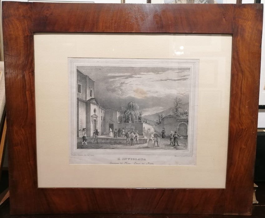 Litografia di dimensioni 17x23,5 cm. Condizioni : USATO - Stato : Buono, ordinari segni d'uso e del tempo. Alcuni segni di foxing. Altre note : Animata veduta di Riva del Garda: precisamente l'autore descrive la vita cittadina che scorre attorno alla chiesa seicentesca dell'Inviolata, edificio in stile barocco fatto costruire da Gaudenzio Madruzzo e dalla moglie Alfonsina Gonzaga. Viandanti, borghesi e religiosi passeggiano o attendono ai loro affari, mentre sopra le loro teste il cielo appare minaccioso di pioggia. Scheda bibliografica tratta da "Panorami dal Garda al Tirolo" a cura di Marina Botteri Ottaviani, scheda n. 8 p. 87.