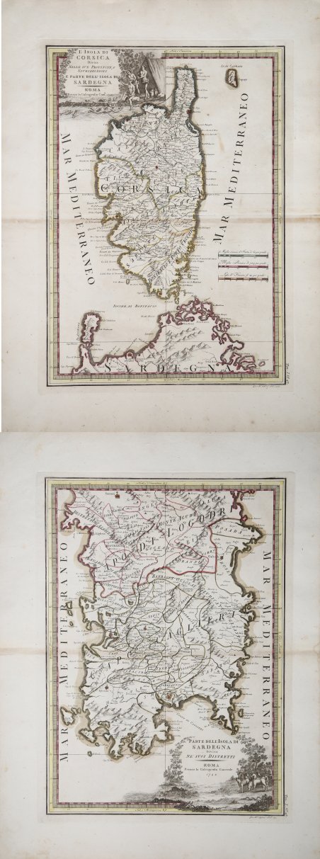 Carta tratta dal "Nuovo Atlante Geografico Universale delineato sulle ultime osservazioni", edito a Roma dal 1792 fino al 1801, opera che la Calcografia Camerale commissionò al Cassini al fine di sostituire l’ormai obsoleto "Mercurio Geografico". Giovanni Maria Cassini, Chierico Regolare Somasco fu geografo e cartografo, ma anche intagliatore di architetture e prospettive - uno dei migliori discepoli di Giovanni Battista Piranesi - Cassini fu uno degli ultimi sferografi italiani del Settecento ed i suoi globi ebbero una notevole diffusione, come pure questo "Nuovo Atlante Geografico". Incisione in rame, finemente colorata nei contorni, in ottimo stato di conservazione. An uncommon map, published in the 'Nuovo Atlante Geografico Universale', with a decorative title cartouche, by Giovanni Maria Cassini, a Somasco monk. He was geographer and cartographer but he was also good at engraving architectural items and perspectives – he was one of the best disciples Giovanni Battista Piranesi had. Moreover, Cassini was one of the last artists to engrave spheres in the XVIII century and his globes were quite famous and widespread, and realized the most important Italian Atlas of the XVIII century; his maps always bear a cartouche, extremely rich in colours and details. Copperplate with fine later hand colour, in very good condition. Cfr. L. Piloni, "Carte geografiche della Sardegna", p. 194, tav. LXXX