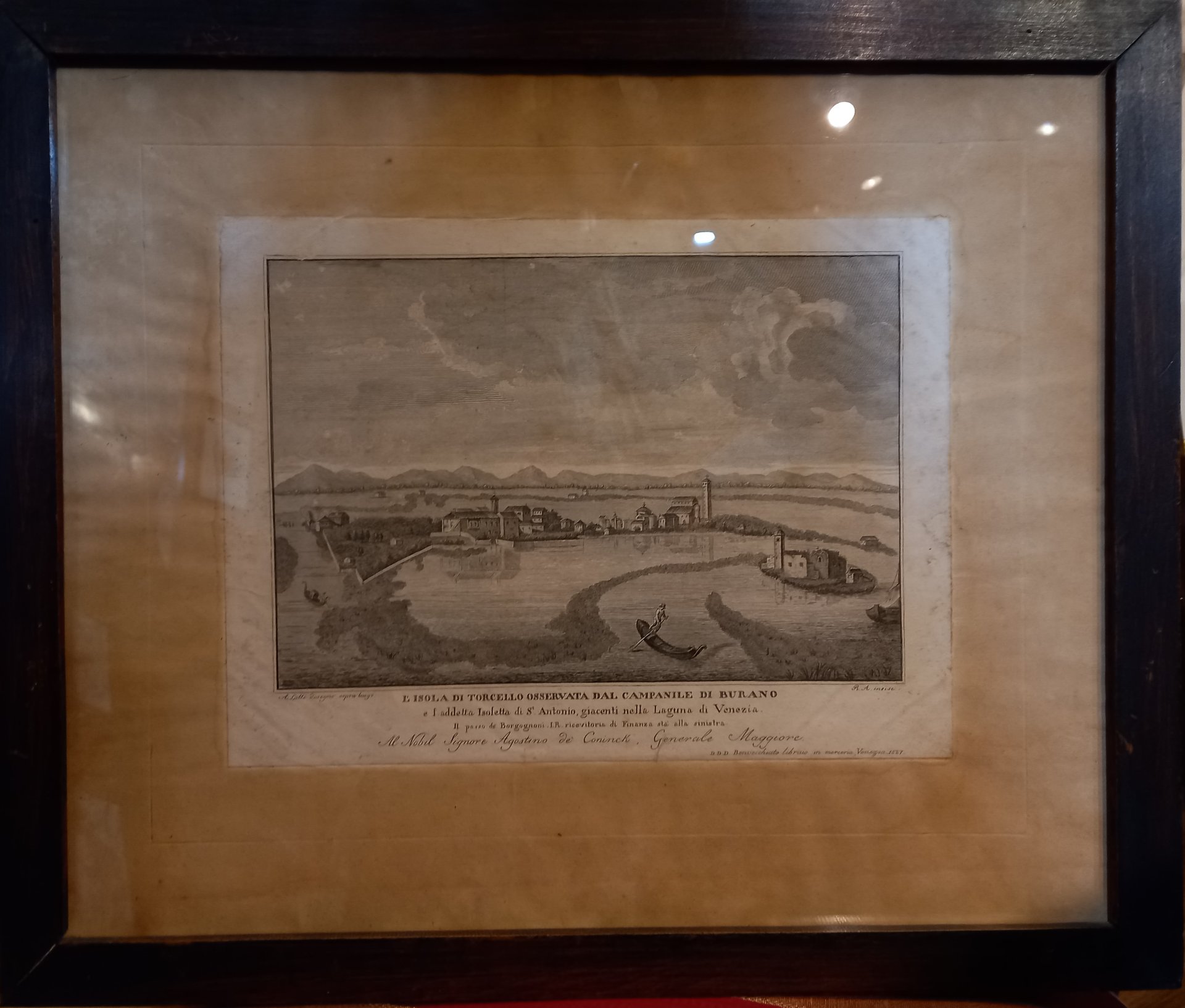 L'Isola di Torcello osservata dal campanile di Burano e l'addetta isoletta di S. Antonio, giagenti nella Laguna di Venezia. Il passo de' Borgognoni I. R. Ricevitoria di Finanza sta alla sinistra.