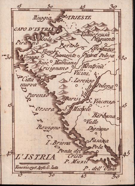 RARITA’ CARTOGRAFICA Sconosciuta piccola carta geografica con imprint di Giacomo Zatta e data 1795, appartenente a un non documentato atlante in miniatura dal titolo “Atlante tascabile per le dame”, suddiviso in tre tomi, stampati “IN VENETIA Presso G. Zatta”, senza data ma circa 1795. Si tratta di carte da visita – con un apposito spazio bianco dove apporre il proprio nome – dove compare l’imprint o di Pietro Zancon (accompagnato dalla data 1794) o di Giacomo Zatta (con data 1794 o 1795), che, come si legge sul frontespizio, risulta l’editore dell’opera. Possiamo ipotizzare che la serie, iniziata da Zancon fu poi terminata dallo Zatta. Sulla carta dell’Italia – presumibilmente la prima tavola dell’opera – compare stampato il nome di Chiara Minelli Rota, nobildonna veneziana che sposò Antonio Rota nel 1794; tutte le restanti 65 carte recano lo spazio bianco privo di nome. In precedenza, le carte erano note solo attraverso una serie, priva di imprint editoriale, venduta 21 anni fa (1999) dall’Antiquariaat Haas di Bedburg Hau; parlando con Stephan Haas, la serie, priva di titolo e dati editoriali si componeva di 70 mappe. Le carte furono vendute separatamente sotto il nome di G. Bonatti, firma dell’incisore che si trova nella carta della Francia. In seguito, le tavole furono attribuite a Pietro Zaricen da Geoffrey King (cfr. Miniature Antique Maps, p. 181). Il nome dello Zaricen viene dedotto dalla carta della contea del Roussillon, che reca l’iscrizione “Venezia 1794 App.o P. Zancon”, letto erroneamente come Zaricen. Lajos Szantai include la carta dell’Ungheria nella sua cartobibliografia, traducendo il nome dell’autore in Zancen (cfr. Atlas Hungaricus 1528-1850). Sempre King, che non menziona nessuna carta firmata da Zatta, sostiene che “About the turn of the century a signed card of the first edition, with a map of the province of Roussillon in the south of France, was seen at an Ephemera Society Fair in London”. Questo esemplare sembrerebbe oggi quello conservato alla Yale University Library [1978 351], che lo descrive composto da 70 carte geografiche. Non sappiamo se sia il numero totale delle mappe, e l’assenza di un indice o dell’elenco non consente di stabilire l’esatto numero delle carte che lo compongono. http://hdl.handle.net/10079/bibid/3611852Confrontando le carte erroneamente attribuite allo Zaricen ci si accorge che la lastra è abrasa in corrispondenza della firma di Zancon o Zatta. Molto scarse sono le notizie sulle carte che possiamo ora definire “ex Zaricen”. Jason Hubbard nella sua bibliografia recente sulle carte del Giappone raffigura la carta priva dell’imprint “App.o G. Zatta” attribuendola - sulla base delle informazioni bibliografiche finora note – a Giuseppe Bonatti e Pietro Zaricen: “This is one of the 70-odd geographical cards, printed on one side only, acquired by the Haas brothers in 1999. The cards cover countries around the world and include detailed map of Italian provinces. The card with the map of France carries the inscription: G. Bonatti fece; and it is presumed that Bonatti engraved all of them although this is questioned by King” (cfr. J. Hubbard, Japoniae Insulae, n. 124). Il nostro esemplare della carta della Francia, che reca l’imprint “Venezia 1794, App.o P. Zancon” reca in basso a destra la firma di Bonatti sopra menzionata. Dunque, l’unica differenza tra questa serie di sconosciute carte sembra essere la presenza degli imprint editoriali di Zancon e Zatta, accompagnati dalla data 1794 o 1795. Giuseppe Bonatti è menzionato da V. Valerio nella qualità di incisore cresciuto alla scuola Remondini di Bassano, autore di alcune carte per l’atlante di Pazzini Carli (Siena, 1788-1800) e per l’Atlante Geografico di Carlo Antonio Barbiellini (Milano, 1807). Dal 1809 in poi lavorò come incisore per il Deposito della Guerra di Milano (cfr. V. Valerio, Cartografi Veneti, p. 153). Pietro Zancon era, assieme . A GREAT RARITY Unknown small map with imprint by Giacomo Zatta and date 1795, belonging to an undocumented miniature atlas entitled “Atlante tascabile per le dame” (Pocket Atlas for ladies), divided into three volumes, printed "IN VENETIA Presso G. Zatta", undated but about 1795. A rare set of visiting cards published in Italy features pretty little maps of all parts of the world - with a special white space where to put your name - where the imprint appears or of Pietro Zancon (accompanied by the date 1794) or Giacomo Zatta (with the date 1794 or 1795), who, as can be read on the title page, is the publisher of the whole Atlas. We can speculate that the series, started by Zancon was later terminated by Zatta. On the map of Italy is printed - presumably the first map of the work - the name of Chiara Minelli Rota, Venetian noblewoman who married Antonio Rota in 1794; all remaining 65 maps bear the blank space without names. Previously, the maps were known only through a series, without editorial imprint, sold 21 years ago (1999) by the Antiquariaat Haas of Bedburg Hau; speaking with Stephan Haas, the series, without title and printing details, consisted of 70 maps. The maps were sold separately under the name of G. Bonatti, the engraver's signature found on the map of France. Later, the plates were attributed to Pietro Zaricen by Geoffrey King (see Miniature Antique Maps, p. 181). The name of Zaricen is derived from the Roussillon county map, which bears the inscription "Venice 1794 App.o P. Zancon", incorrectly read as Zaricen. Lajos Szantai includes the map of Hungary in his cartobibliography, translating the author's name into Zancen (see Atlas Hungaricus 1528-1850). Always King, who does not mention any map signed by Zatta, said: "About the turn of the century a signed card of the first edition, with a map of the province of Roussillon in the south of France, was seen at an Ephemera Society Fair in London ". This copy would seem to be the one preserved in the Yale 