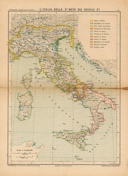 Carta geografica originale, con piega centrale editoriale, raffigurante l'Italia nella 2° metà del secolo X°. Macchie alla piega