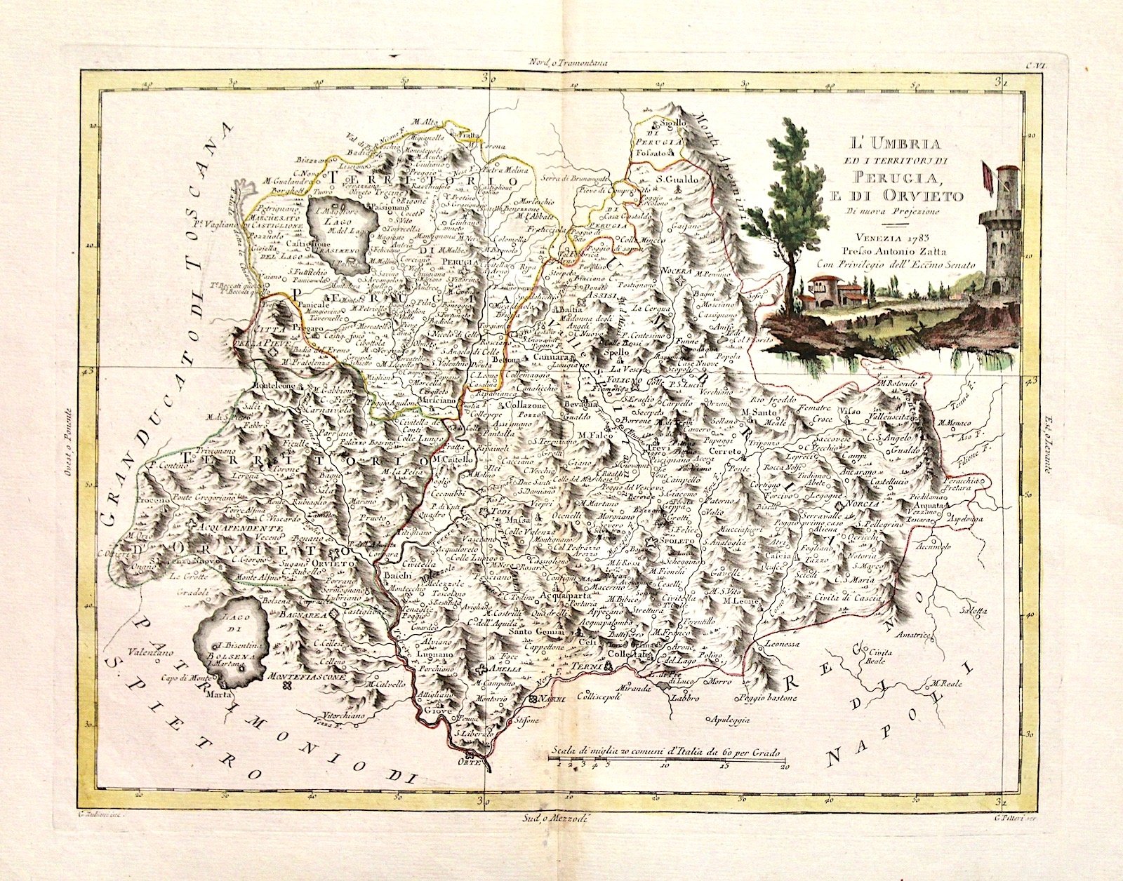 Incisione in rame di mm 310x405, colorata d'epoca ai confini. In alto a destra bel cartiglio figurato e dipinto. Antonio Zatta (1775-1797) è stato uno dei più importanti editori di carte geografiche del trardo XVIII secolo italiano. La sua opera costituisce un importante punto di passaggio tra la cartografia antica e moderna, più attenta all'accuratezza dei dettagli geografici che all'abbellimento estetico ricco di motivi mitologici o d'invenzione, come era quello dell'epoca precedente. La sua opera più importante è Atlante novissimo pubblicato tra il 1775 e il 1789. Buon eseplare. <BR>
