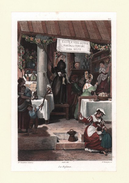 Tavola tratta dal celebre ' L'Italie, la Sicile, les Iles Éoliennes, l'Ile d'Elbe, la Sardaigne, Malte, l'Ile de Calypso etc. D'après les inspirations, les recherches et les travaux de M. M. le Vicomte de Chateaubriand, De Lamartine, Raoul-Rochette, le Comte de Forbin, Piranesi, Mazzara, et de Napoléon, Denon, Saint-Non, Lord Byron, Goethe, Visconti, Cicognara, Lanzi, de Bonstetten, Swinburne, etc. Sites, Monumens, Scènes et Costumes, d'après M.me Haudebourt-Lescot, MM. Horace-Vernet, Granet, Isabey, Ciceri, Mazzara, le Major Light, le Cap. Batty, Cooke, Gell et Gandy, Pinelli, Ferrari, Zucoli, et beaucoup d'autres artistes italiens. Recueillis et publiés par Audot Père, Membre de la Société de Géographie, ' edito a Parigi tra il 1834 ed il 1837 e ristampato a Torino [Giuseppe Pomba e Ca, 1834-1838]. L'opera, in cinque volumi, raccoglie scritti di autori vari, curati da Audot, ed è riccamente illustrata da 324 incisioni su acciaio fuori testo, molte delle quali con accostamento multiplo, per un totale di 473 tavole. Fu notoriamente mastodontico il lavoro cui si sottopose Louis Eustache Audot (1783-1870). ' Finemente colorata a mano. Plate taken from the famous ' L'Italie, la Sicile, les Iles Éoliennes, l'Ile d'Elbe, la Sardaigne, Malte, l'Ile de Calypso etc. D'après les inspirations, les recherches et les travaux de M. M. le Vicomte de Chateaubriand, De Lamartine, Raoul-Rochette, le Comte de Forbin, Piranesi, Mazzara, et de Napoléon, Denon, Saint-Non, Lord Byron, Goethe, Visconti, Cicognara, Lanzi, de Bonstetten, Swinburne, etc. Sites, Monumens, Scènes et Costumes, d'après M.me Haudebourt-Lescot, MM. Horace-Vernet, Granet, Isabey, Ciceri, Mazzara, le Major Light, le Capt. Batty, Cooke, Gell et Gandy, Pinelli, Ferrari, Zucoli, et beaucoup d'autres artistes italiens. Recueillis et publiés par Audot Père, Membre de la Société de Géographie, ' published in Paris between 1834 and 1837 and reprinted in Turin [Giuseppe Pomba e Ca, 1834-1838]. The work, in five volumes, collects the writings of various authors, edited by Audot, and is richly illustrated with 324 engravings on steel outside the text, many of them with multiple combinations, for a total of 473 tables. Louis Eustache Audot (1783-1870) was a notoriously mammoth task. ' Finely hand-colored. Cfr.
