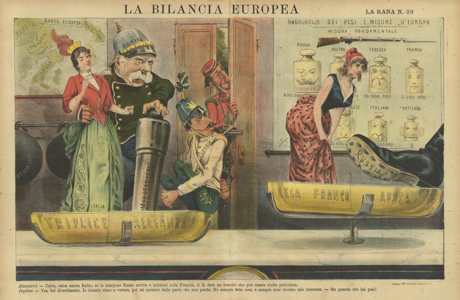 Litografia, antica ed originale, stampata a colori, tratta dal ricercato e raro giornale umoristico settimanale LA RANA, fondato a Bologna nel novembre 1865 da Leonida Gioannetti e da Augusto Grossi. Fu un giornale di grande successo per le sue satiriche caricature a colori di cui alcune in qudruplo foglio che fu uno dei successi editoriali. I politici, lo Stato Ecclesiastico e la politica europea furono i prediletti ispiratori. Il periodico affrontò una grave crisi nel 1873, quando Grossi decise di abbandonare la redazione per fondare Il Papagallo. La Rana sospese le pubblicazioni nel 1911, per cessarle definitivamente nel 1912. Numero 39 pubblicato venerdi 27 settembra 1889. Nella scena la diatriba sulla bilancia tra "la triplice alleanza" contro la "lega franco russa", intanto alla porta appare un inglese che aspetta di mettersi insieme al vincitore.
