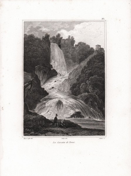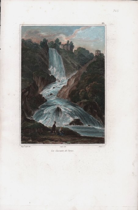 Veduta tratta dal celebre ' L'Italie, la Sicile, les Iles Éoliennes, l'Ile d'Elbe, la Sardaigne, Malte, l'Ile de Calypso etc. D'après les inspirations, les recherches et les travaux de M. M. le Vicomte de Chateaubriand, De Lamartine, Raoul-Rochette, le Comte de Forbin, Piranesi, Mazzara, et de Napoléon, Denon, Saint-Non, Lord Byron, Goethe, Visconti, Cicognara, Lanzi, de Bonstetten, Swinburne, etc. Sites, Monumens, Scènes et Costumes, d'après M.me Haudebourt-Lescot, MM. Horace-Vernet, Granet, Isabey, Ciceri, Mazzara, le Major Light, le Cap. Batty, Cooke, Gell et Gandy, Pinelli, Ferrari, Zucoli, et beaucoup d'autres artistes italiens. Recueillis et publiés par Audot Père, Membre de la Société de Géographie, ' edito a Parigi tra il 1834 ed il 1837 e ristampato a Torino [Giuseppe Pomba e Ca, 1834-1838]. L'opera, in cinque volumi, raccoglie scritti di autori vari, curati da Audot, ed è riccamente illustrata da 324 incisioni su acciaio fuori testo, molte delle quali con accostamento multiplo, per un totale di 473 tavole. Fu notoriamente mastodontico il lavoro cui si sottopose Louis Eustache Audot (1783-1870). Plate taken from the famous ' L'Italie, la Sicile, les Iles Éoliennes, l'Ile d'Elbe, la Sardaigne, Malte, l'Ile de Calypso etc. D'après les inspirations, les recherches et les travaux de M. M. le Vicomte de Chateaubriand, De Lamartine, Raoul-Rochette, le Comte de Forbin, Piranesi, Mazzara, et de Napoléon, Denon, Saint-Non, Lord Byron, Goethe, Visconti, Cicognara, Lanzi, de Bonstetten, Swinburne, etc. Sites, Monumens, Scènes et Costumes, d'après M.me Haudebourt-Lescot, MM. Horace-Vernet, Granet, Isabey, Ciceri, Mazzara, le Major Light, le Capt. Batty, Cooke, Gell et Gandy, Pinelli, Ferrari, Zucoli, et beaucoup d'autres artistes italiens. Recueillis et publiés par Audot Père, Membre de la Société de Géographie, ' published in Paris between 1834 and 1837 and reprinted in Turin [Giuseppe Pomba e Ca, 1834-1838]. The work, in five volumes, collects the writings of various authors, edited by Audot, and is richly illustrated with 324 engravings on steel outside the text, many of them with multiple combinations, for a total of 473 tables. Louis Eustache Audot (1783-1870) was a notoriously mammoth task. Cfr. Cremonini pag.201/202, 121,122; Olscki, "Choix", 1108, "Ouvrage monumental qui conservera toujours une grande valeur ". Menichelli, 846. Fossati-Bellani, I, 522.