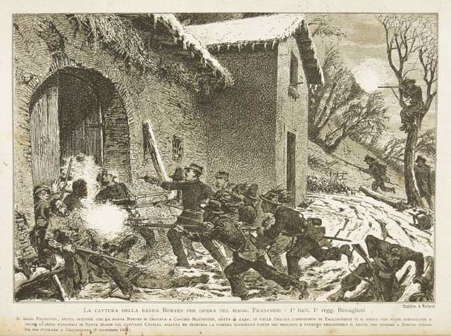 Raffigurazione dell'assalto alla Cascina Mastroddi e della cattura della banda Boryes, nei pressi di Tagliacozzo