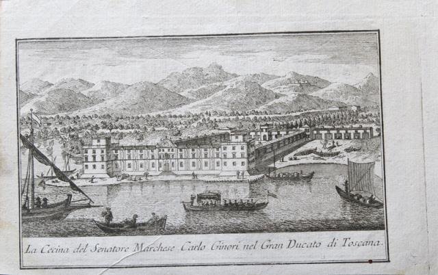 Tratta da “Lo Stato Presente di tutti i Paesi e Popoli del Mondo”, edito a Venezia dal 1740 al 1766. Incisione in rame all’acquaforte, b/n, cm 9,5 x 15,5 ca. (la parte incisa) più i margini. Piccola veduta della villa del Marchese Carlo Ginori, con il primo piano animato da barche e pescatori. Esemplare con stretti margini ma in buona impressione e ben conservato.