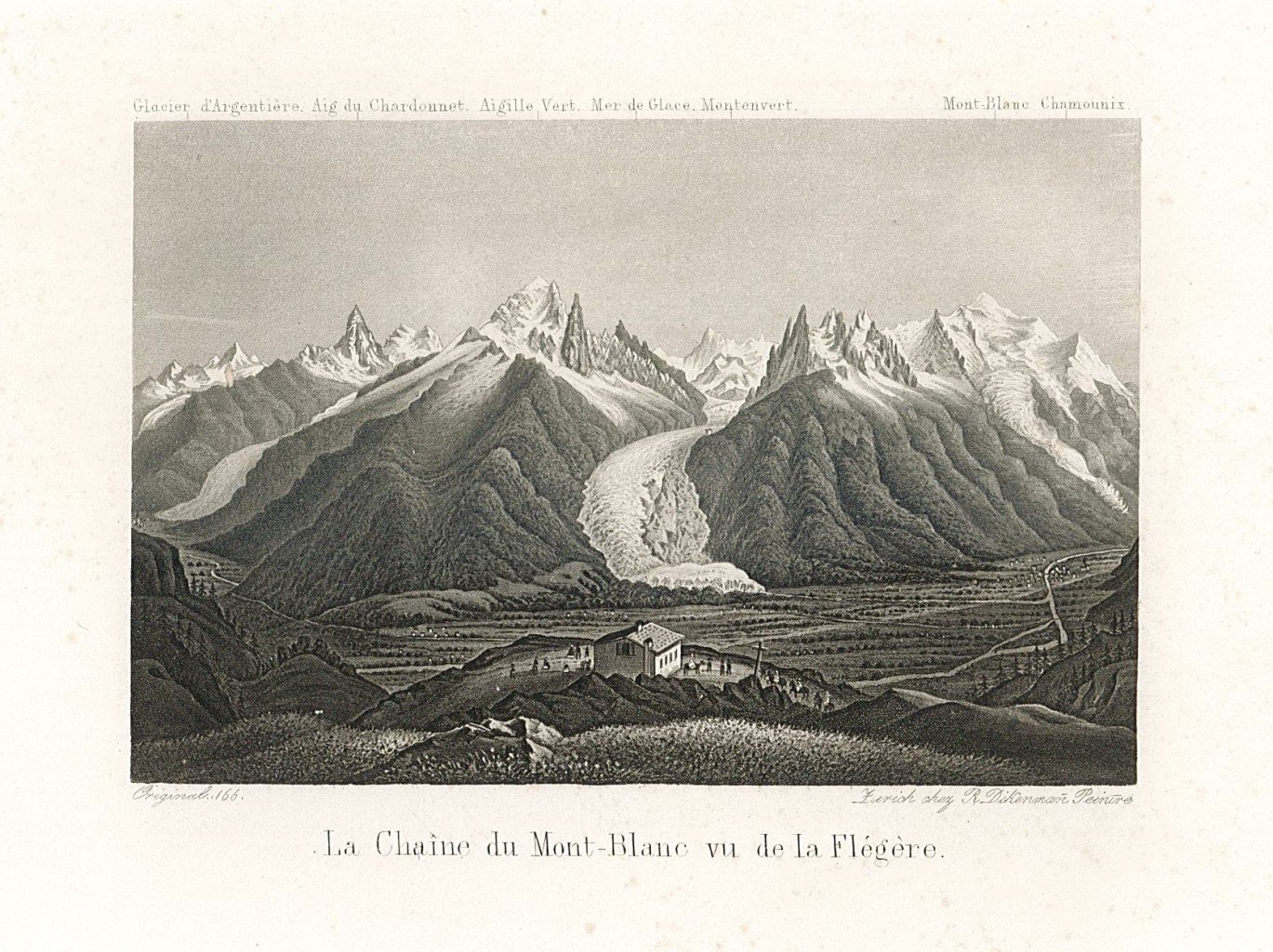 Stampa, antica ed originale, raffigurante il panorama della catena del Monte Bianco preso da la Flégère in raffinata acquatinta. Inserita nell'opera "Souvenir de la Suisse" edita a Zurigo. Autore: Dikenmann Rudolf dis. (1793 Zürich 1883). Luogo: Monte Bianco. Anno: 1860 ca. Tecnica: acquatinta. Dimensioni: 74x112 mm