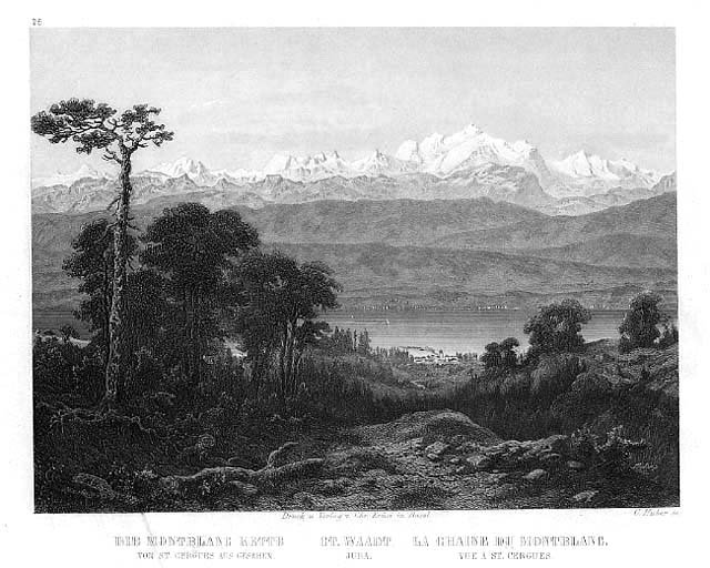 Stampa antica ed originale con veduta della catena del Bianco visto dallo Jura Canton Waadt