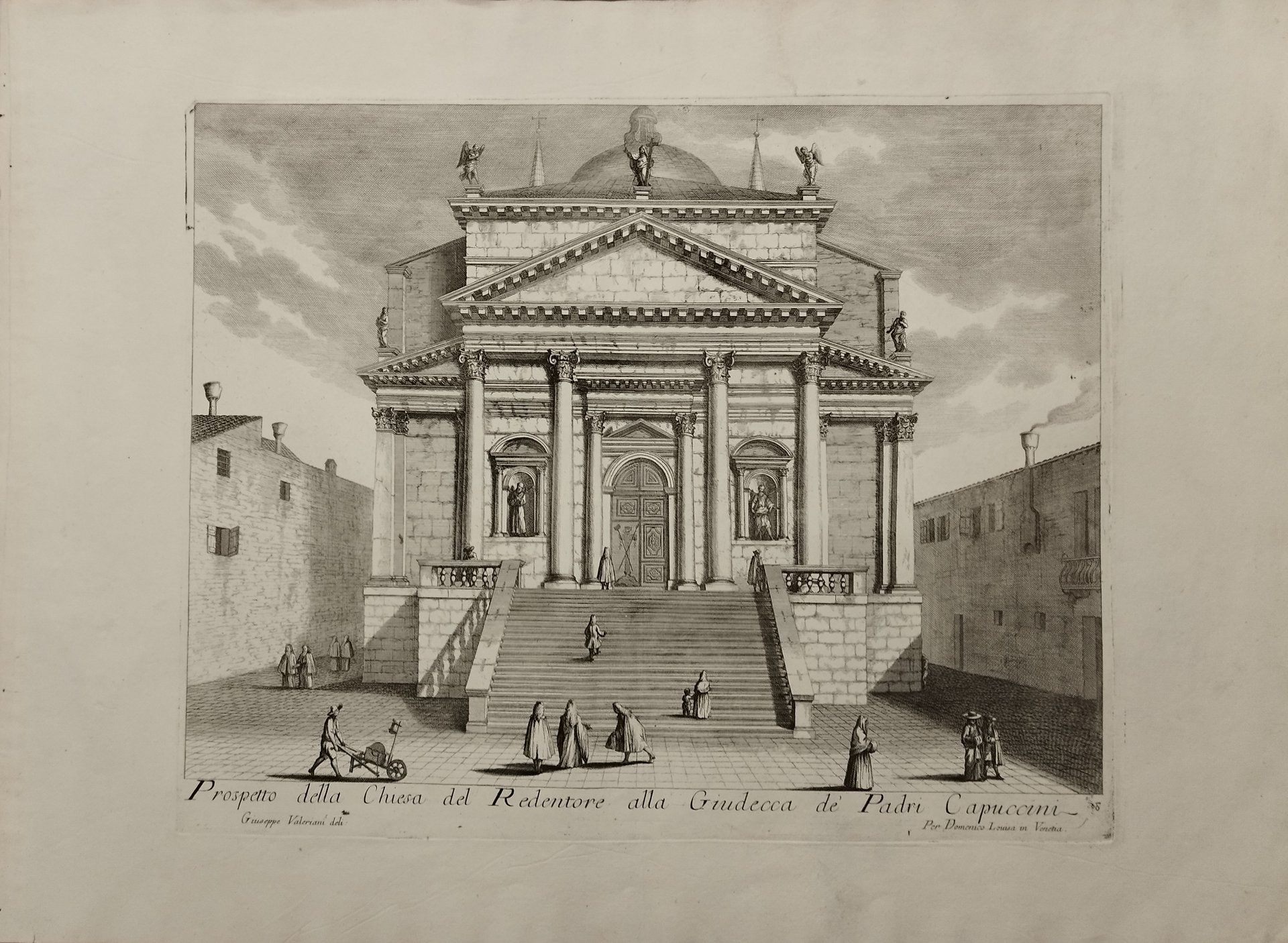 Acquaforte e bulino di mm 467 x 374 su foglio di mm 661 x 486. In centro in basso "Prospetto della Chiesa del Redentore alla Giudecca de' Padri Capuccini". Più sotto in piccolo a sinistra "Giuseppe Valeriani deli." , mentre a destra "Per Domenico Lovisa in Venetia". Carta pastosa, spessa, fittamente vergata. Stato I/I. Margini pieni. Foglio senza difetti. Proveniente da: "Il gran teatro di Venezia ovvero raccolta delle principali vedute e pitture che in essa si contengono diviso in due tomi. ". ll foglio fa parte della prima edizione della grande opera di Domenico Lovisa, pubblicata a Venezia intorno al 1717. La Raccolta comprende 122 come risulta dagli indici contenuti nel primo tomo. Quest'ultimo si compone di 57 vedute di Venezia che furono incise da Filippo Vasconi, Giuseppe Valeriani, Carlo e Andrea Zucchi, e da un anonimo intagliatore che siglava le tavole con le iniziali SF. La maggior parte delle vedute però non sono firmate. Cicogna 4541, Succi 230.