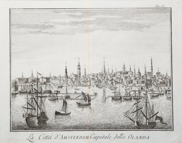 Veduta della città tratta dall’edizione italiana dell’opera di Thomas Salmon ' Lo stato presente di tutti i paesi e popoli del mondo naturale, politico e morale con nuove osservazioni degli antichi e moderni viaggiatori. Scritto in inglese dal signor Salmon. Tradotto in Ollandese, e Francese, Tedescho ed ora in Italiano. In Venezia, Presso Giambattista Albrizzi MDCCXXXVII-MDCCLVI (1737-66). L’opera - in ventisette volumi - il cui titolo originale era ' Modern history, or the present state of all nations, ' fu tradotta dall’inglese e stampata in Venezia dall’Albrizzi nell’arco di svariati anni; traccia un’analisi storica delle nazioni del mondo, arricchita dalla descrizione geografica e artistica delle città. All’interno sono presenti preziose incisioni su rame che raffigurano il territorio, le vedute e i monumenti. Comunemente si attribuiscono le tavole al Salmon in quanto i volumi dell'Albrizzi sono la traduzione in lavoro che apparve tra il 1725 e il 1739 a Londra in 32 volumi. Tuttavia, le carte geografiche contenute nell’opera sono le stesse che Albrizzi utilizza per il suo Atlante Novissimo, che contiene tutte le parti del mondo del 1740 (volume 1) - 1750 (volume 2), derivanti dalle opere di Guillaulme de L’Isle e Iasaak Tirion. Le stesse piante prospettiche e vedute contenute nel Lo stato presente di tutti i paesi e popoli del mondo sono altrèsì da assegnare all’Albrizzi in qualità di editore. L'autore andava particolarmente fiero di questa collana perché questo era “il primo libro di viaggi […] che si sia proposto per iscopo la verità e non la meraviglia”. La fortuna della pubblicazione fu eclatante tanto che “arrivato a pubblicare appena l'ottavo tomo mi trovai ben tosto, per esito fortunato, privo d'ogni esemplare”. Giambattista Albrizzi fa parte di una famiglia di tipografi ed editori veneziani di origine bergamasca. Iniziatore dell'attività tipografica fu, negli ultimi decenni del XVII secolo, Girolamo Albrizzi a cui successe il figlio Giambattista, attivo particolarmente nel ventennio 1730-50. Diede grande impulso all'arte tipografica veneziana, legando il proprio nome a una serie di splendide edizioni, per cui si valse della collaborazione dei migliori disegnatori e incisori del tempo: Piazzetta, Zanetti, Pitteri e Bartolozzi. Incisione in rame, in ottimo stato di conservazione. Bibliografia V. Valerio, Cartografi Veneti, p. 139. Plate taken from Lo stato presente di tutti i paesi e popoli del mondo naturale, politico e morale con nuove osservazioni degli antichi e moderni viaggiatori. Scritto in inglese dal signor Salmon. Tradotto in Ollandese, e Francese, Tedescho ed ora in Italiano. In Venezia, Presso Giambattista Albrizzi MDCCXXXVII-MDCCLVI (1737-66). The work - in twenty-seven volumes - whose original title was Modern history, or the present state of all nations, was translated from English and printed in Venice by Albrizzi in the space of several years; it traces a historical analysis of the nations of the world, enriched by the geographical and artistic description of the cities. Inside there are precious copper engravings that depict the territory, views and monuments. Commonly the plates are attributed to Salmon because the volumes of Albrizzi are the translation in work that appeared between 1725 and 1739 in London in 32 volumes. However, the maps in the work are the same that Albrizzi used for his Atlante Novissimo, che contiene tutte le parti del mondo from 1740 (volume 1) - 1750 (volume 2), derived from the works of Guillaulme de L'Isle and Iasaak Tirion. The same perspective plans and views contained in Lo stato presente di tutti i paesi e popoli del mondo are also to be assigned to Albrizzi as editor. The author was particularly proud of this series because this was "the first travel book [.] that has proposed for its purpose the truth and not the wonder. The fortune of the publication was so striking that "when I arrived to publish just the eighth volume, I soon found myself, due to a lucky outcome, without any copies". Giambattista Albrizzi is part of a family of printers and publishers of Venice from Bergamo. Start of printing was in the last decades of the seventeenth century, Girolamo Albrizzi was succeeded by his son Giambattista, particularly active in the twenty years 1730-50. He gave great impetus to the art printing Venetian, linking its name to a series of magnificent editions, which earned him the collaboration of the best designers and engravers of the time: Piazzetta, Zanetti, Pitteri and Bartolozzi. Copperplate, in good condition. Bibliografia V. Valerio, Cartografi Veneti, p. 139. Cfr.