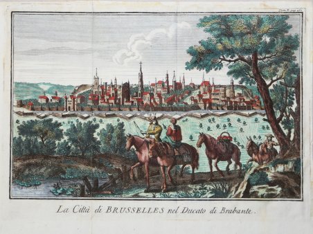 Veduta della città tratta dall’edizione italiana dell’opera di Thomas Salmon ' Lo stato presente di tutti i paesi e popoli del mondo naturale, politico e morale con nuove osservazioni degli antichi e moderni viaggiatori. Scritto in inglese dal signor Salmon. Tradotto in Ollandese, e Francese, Tedescho ed ora in Italiano. In Venezia, Presso Giambattista Albrizzi MDCCXXXVII-MDCCLVI (1737-66). L’opera - in ventisette volumi - il cui titolo originale era ' Modern history, or the present state of all nations, ' fu tradotta dall’inglese e stampata in Venezia dall’Albrizzi nell’arco di svariati anni; traccia un’analisi storica delle nazioni del mondo, arricchita dalla descrizione geografica e artistica delle città. All’interno sono presenti preziose incisioni su rame che raffigurano il territorio, le vedute e i monumenti. Comunemente si attribuiscono le tavole al Salmon in quanto i volumi dell'Albrizzi sono la traduzione in lavoro che apparve tra il 1725 e il 1739 a Londra in 32 volumi. Tuttavia, le carte geografiche contenute nell’opera sono le stesse che Albrizzi utilizza per il suo Atlante Novissimo, che contiene tutte le parti del mondo del 1740 (volume 1) - 1750 (volume 2), derivanti dalle opere di Guillaulme de L’Isle e Iasaak Tirion. Le stesse piante prospettiche e vedute contenute nel Lo stato presente di tutti i paesi e popoli del mondo sono altrèsì da assegnare all’Albrizzi in qualità di editore. L'autore andava particolarmente fiero di questa collana perché questo era “il primo libro di viaggi […] che si sia proposto per iscopo la verità e non la meraviglia”. La fortuna della pubblicazione fu eclatante tanto che “arrivato a pubblicare appena l'ottavo tomo mi trovai ben tosto, per esito fortunato, privo d'ogni esemplare”. Giambattista Albrizzi fa parte di una famiglia di tipografi ed editori veneziani di origine bergamasca. Iniziatore dell'attività tipografica fu, negli ultimi decenni del XVII secolo, Girolamo Albrizzi a cui successe il figlio Giambattista, attivo particolarmente nel ventennio 1730-50. Diede grande impulso all'arte tipografica veneziana, legando il proprio nome a una serie di splendide edizioni, per cui si valse della collaborazione dei migliori disegnatori e incisori del tempo: Piazzetta, Zanetti, Pitteri e Bartolozzi. Incisione in rame, in ottimo stato di conservazione. Bibliografia V. Valerio, Cartografi Veneti, p. 139. Plate taken from Lo stato presente di tutti i paesi e popoli del mondo naturale, politico e morale con nuove osservazioni degli antichi e moderni viaggiatori. Scritto in inglese dal signor Salmon. Tradotto in Ollandese, e Francese, Tedescho ed ora in Italiano. In Venezia, Presso Giambattista Albrizzi MDCCXXXVII-MDCCLVI (1737-66). The work - in twenty-seven volumes - whose original title was Modern history, or the present state of all nations, was translated from English and printed in Venice by Albrizzi in the space of several years; it traces a historical analysis of the nations of the world, enriched by the geographical and artistic description of the cities. Inside there are precious copper engravings that depict the territory, views and monuments. Commonly the plates are attributed to Salmon because the volumes of Albrizzi are the translation in work that appeared between 1725 and 1739 in London in 32 volumes. However, the maps in the work are the same that Albrizzi used for his Atlante Novissimo, che contiene tutte le parti del mondo from 1740 (volume 1) - 1750 (volume 2), derived from the works of Guillaulme de L'Isle and Iasaak Tirion. The same perspective plans and views contained in Lo stato presente di tutti i paesi e popoli del mondo are also to be assigned to Albrizzi as editor. The author was particularly proud of this series because this was "the first travel book [.] that has proposed for its purpose the truth and not the wonder. The fortune of the publication was so striking that "when I arrived to publish just the eighth volume, I soon found myself, due to a lucky outcome, without any copies". Giambattista Albrizzi is part of a family of printers and publishers of Venice from Bergamo. Start of printing was in the last decades of the seventeenth century, Girolamo Albrizzi was succeeded by his son Giambattista, particularly active in the twenty years 1730-50. He gave great impetus to the art printing Venetian, linking its name to a series of magnificent editions, which earned him the collaboration of the best designers and engravers of the time: Piazzetta, Zanetti, Pitteri and Bartolozzi. Copperplate, in good condition. Bibliografia V. Valerio, Cartografi Veneti, p. 139. Cfr.