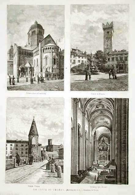 Insieme di quattro vignette, raffiguranti Trento: il Duomo (esterno e interno), la Torre di Piazza e la Torre Verde. Testo al verso.