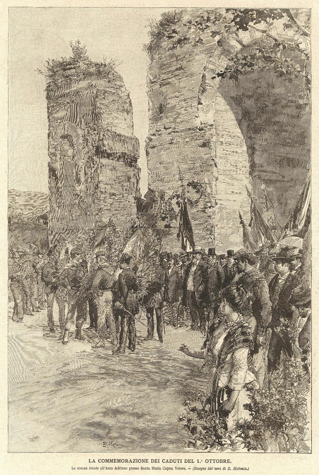 Stampa, antica ed originale, con raffigurazione della cerimonia di commemorazione per i caduti della battaglia del Volturno (1860). Autore: Matania E. dis. Luogo: Santa Maria Capua Vetere. Anno: 1890. Tecnica: xilografia. Dimensioni: 346x236. Testo al verso
