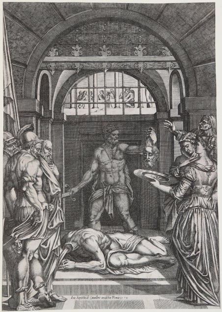 Bulino, 1578, datato e firmato in lastra, in basso al centro, 'Ioa baptista de Cavalleris incidebat Romae 1578'. Magnifica prova, ricca di toni, impressa su carta vergata coeva con filigrana “cerchio con stella a quattro punte”, rifilata alla linea marginale, in ottimo stato di conservazione.L’incisione riproduce, nello stesso verso, la splendida pala d’altare completata sotto la direzione di Giorgio Vasari nel 1553, per la chiesa romana che proprio da quest’opera prende il nome di S. Giovanni Decollato. La scena, sviluppata in profondità, è ambientata all’interno della prigione in cui il Battista era stato rinchiuso da Erode. Ai lati, due file formato a sinistra da soldati, a destra da ancelle. La loro disposizione guida/conduce lo spettatore verso il centro della stanza, dove giace decapitato il corpo del Battista Il risalto della sua figura è ottenuto con un abile gioco di luci ed ombre: la figura del suo carnefice, che con la mano sinistra tiene dai capelli la testa del Battista, nell’atto di riporla sul vassoio, è delineata con un tratteggio molto fitto, così da risultare completamente in ombra, quale figura tenebrosa e malvagia.Opera di grande rarità. Engraving, Signed and dated lower centre: 'Ioa baptista de Cavalleris incidebat Romae 1578'. Only stateAfter Giorgio Vasari's altarpiece in the same direction, in the Roman church of San Giovanni Decollato,from which takes its name San Giovanni Decollato, Rome.A great impression, printed on contemporary laid paper with "star in a cricle" watermark, trimmed to the platemark, very good condition.Vasari’s painting has similarities of the same story by Andrea del Sarto and by Dürer. Unlike these two artists, Vasari graphically depicts the blood spurting from the arteries in the Baptist’s neck. Cranach’s woodcut may be the ultimate source for this treatment.The scene takes place in the prison where the Baptist had been imprisoned by Herod. On either side, two rows formed to the left by soldiers, on the right from maids. Their layout / guide takes the viewer into the center of the room, where lies the body of the Baptist beheaded. His figure is emphasized by a clever use of light and shadow. The figure of the executioner, who holds in his left hand the head of the Baptist, in the act of storing it on the tray, is outlined with a very dense hatch, so as to be completely in the shade, as dark and evil figure. Cfr. Scorsetti, in Grafica d’Arte 49, 2002, no. 15; S. Gregory, Vasari and the Renaissance Print, p. 352.