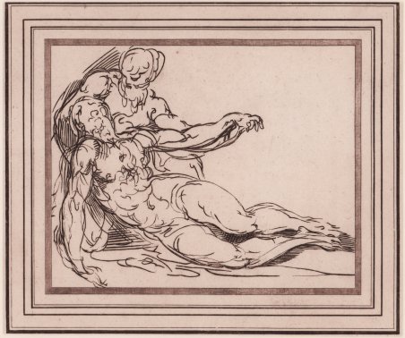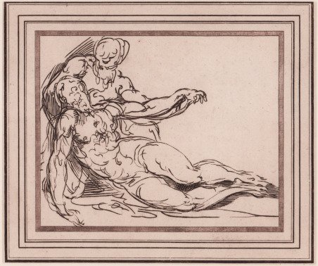 Acquaforte stampata in marrone, da Parmigianino. La deposizione, particolare da uno schizzo del Parmigianino (Popham 1971, n. 373); il corpo di Cristo sostenuto da una figura che siede a sinistra e che lo guarda addolorata; in una cornice rettangolare a imitazione di una montatura per lavabo. Magnifica prova, impressa su carta vergata coeva, rifilata al rame, in perfetto stato di conservazione. L'opera è parte della raccolta di Charles Rogers, ' A Collection of Prints in Imitation of Drawings. To which are annexed lives of their authors, edita a Londra da John Boydell e altri nel 1778. Le tavole che sono contenute nell'opera riproducono, a grandezza naturale e con gli stessi colori, una serie di disegni antichi nella collezione del Rogers. Etching printed in brown, after Parmigianino. The Deposition, a detail after a sketch by Parmigianino (Popham 1971, no. 373); Christ's body supported by a figure who sits to left, looking down at Him sorrowfully; in rectangular frame in imitation of a wash mount. The work is part of Charles Rogers, ' A Collection of Prints in Imitation of Drawings. To which are annexed lives of their authors. printed by J. Nichols in London, and sold by John Boydell, Benjamin White, and Peter Molini, 1778. The plates, which use a wide variety of techniques, show some old master drawings in Rogers's own collection. His preface states: “That these prints may be faithful imitations, they are engraved the same way as, as well as the same size, as the Originals are drawn; and printed, as nearly as possible, in the same colours”. A fine impression, printed on contemporary laid paper, trimmed to the borderline, perfect condition. Cfr.