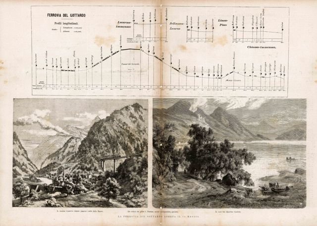 Carta dei profili longitudinali della Ferrovia del Gottardo. In basso a sinistra la veduta della ferrovia sul grande viadotto di Amsteg ed a destra il Lago dei Quattro Cantoni. Testo al verso, piega editoriale