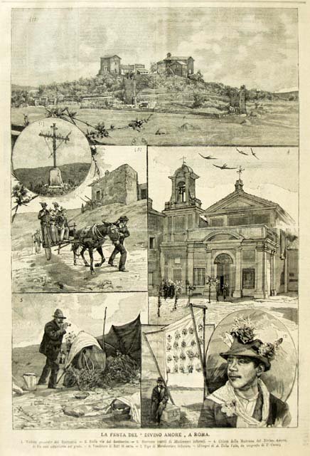 Veduta del santuario e raffigurazione del pellegrinaggio. Testo al verso, pieghe