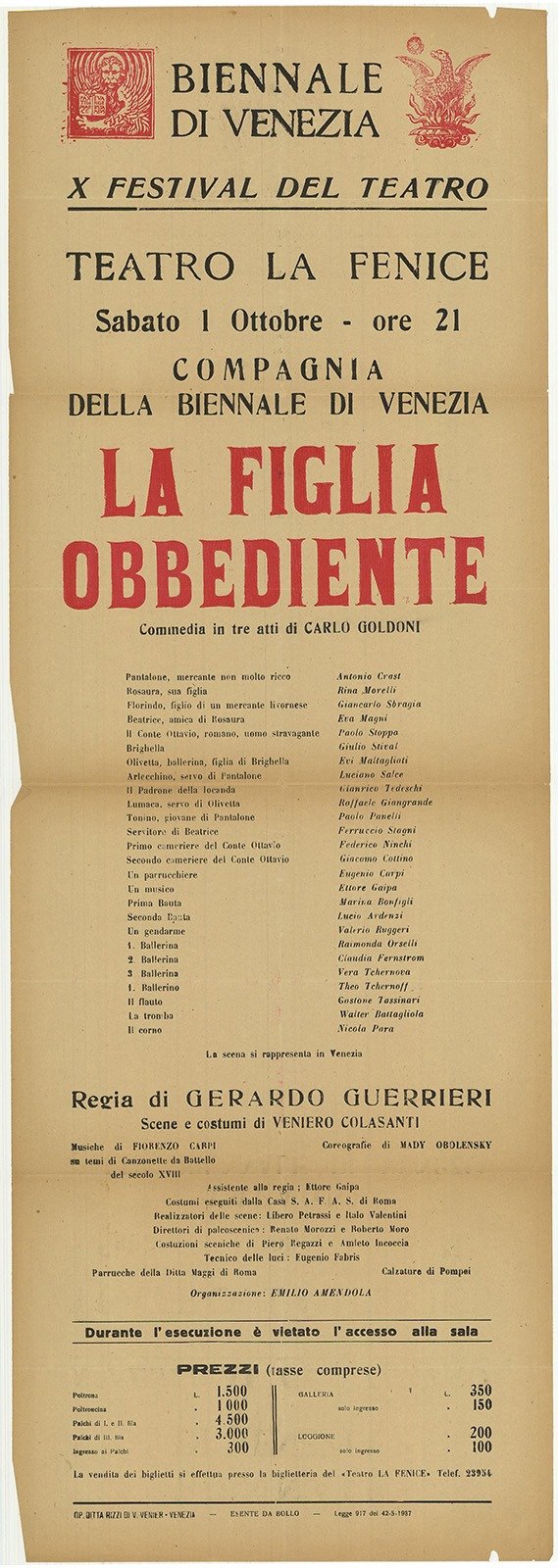 Commedia in tre atti di Carlo Goldoni, regia di Gerardo Guerrieri. Biennale di Venezia, X festival del teatro, Teatro la Fenice, Compagnia della Biennale di Venezia. Tip. ditta Rizzi di V. Venier - Venezia. Locandina ripiegata più volte, piccole mancanze ai margini e leggera usura. Segni al retro