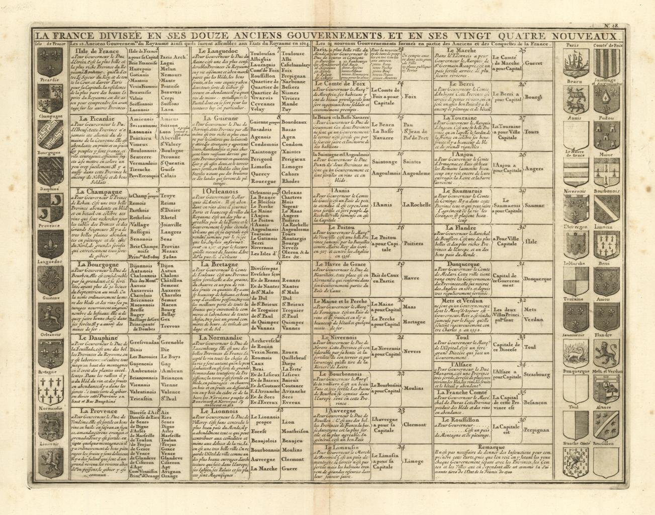 Carta dei governamenti, antica ed originale, inserita nel I Tomo ”Atlas Historique ou nouvelle introduction a l’Histoire, à la Chronologie & à la Geographie Ancienne & Moderne…”, pubblicato ad Amsterdam nel 1713. Atlante che, con la sua pubblicazione, coniuga le mappe geografiche con incisioni e informazioni di carattere geografico, araldico, etnografico e storico così rendendo l’opera in sette volumi molto innovativa. Dimensioni 340x445 mm.Henri Abraham Chatelain (1684 - 1743), pastore ugonotto originario di Parigi visse alternativamente a Parigi, Londra, L'Aia ed Amsterdam. Conosciuto come cartografo olandese per il sua opera cartografica monumentale in sette volumi “Atlas Historique” pubblicata ad Amsterdam con i suoi fratelli. Grafico delle prime regioni della Francia. Mappa che comprende 36 stemmi e note storiche