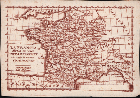RARITA’ CARTOGRAFICA Sconosciuta piccola carta geografica con imprint di Pietro Zancon e data 1794, appartenente a un non documentato atlante in miniatura dal titolo “Atlante tascabile per le dame”, suddiviso in tre tomi, stampati “IN VENETIA Presso G. Zatta”, senza data ma circa 1795. Si tratta di carte da visita – con un apposito spazio bianco dove apporre il proprio nome – dove compare l’imprint o di Pietro Zancon (accompagnato dalla data 1794) o di Giacomo Zatta (con data 1794 o 1795), che, come si legge sul frontespizio, risulta l’editore dell’opera. Possiamo ipotizzare che la serie, iniziata da Zancon fu poi terminata dallo Zatta. Sulla carta dell’Italia – presumibilmente la prima tavola dell’opera – compare stampato il nome di Chiara Minelli Rota, nobildonna veneziana che sposò Antonio Rota nel 1794; tutte le restanti 65 carte recano lo spazio bianco privo di nome. In precedenza, le carte erano note solo attraverso una serie, priva di imprint editoriale, venduta 21 anni fa (1999) dall’Antiquariaat Haas di Bedburg Hau; parlando con Stephan Haas, la serie, priva di titolo e dati editoriali si componeva di 70 mappe. Le carte furono vendute separatamente sotto il nome di G. Bonatti, firma dell’incisore che si trova nella carta della Francia. In seguito, le tavole furono attribuite a Pietro Zaricen da Geoffrey King (cfr. Miniature Antique Maps, p. 181). Il nome dello Zaricen viene dedotto dalla carta della contea del Roussillon, che reca l’iscrizione “Venezia 1794 App.o P. Zancon”, letto erroneamente come Zaricen. Lajos Szantai include la carta dell’Ungheria nella sua cartobibliografia, traducendo il nome dell’autore in Zancen (cfr. Atlas Hungaricus 1528-1850). Sempre King, che non menziona nessuna carta firmata da Zatta, sostiene che “About the turn of the century a signed card of the first edition, with a map of the province of Roussillon in the south of France, was seen at an Ephemera Society Fair in London”. Questo esemplare sembrerebbe oggi quello conservato alla Yale University Library [1978 351], che lo descrive composto da 70 carte geografiche. Non sappiamo se sia il numero totale delle mappe, e l’assenza di un indice o dell’elenco non consente di stabilire l’esatto numero delle carte che lo compongono. http://hdl.handle.net/10079/bibid/3611852Confrontando le carte erroneamente attribuite allo Zaricen ci si accorge che la lastra è abrasa in corrispondenza della firma di Zancon o Zatta. Molto scarse sono le notizie sulle carte che possiamo ora definire “ex Zaricen”. Jason Hubbard nella sua bibliografia recente sulle carte del Giappone raffigura la carta priva dell’imprint “App.o G. Zatta” attribuendola - sulla base delle informazioni bibliografiche finora note – a Giuseppe Bonatti e Pietro Zaricen: “This is one of the 70-odd geographical cards, printed on one side only, acquired by the Haas brothers in 1999. The cards cover countries around the world and include detailed map of Italian provinces. The card with the map of France carries the inscription: G. Bonatti fece; and it is presumed that Bonatti engraved all of them although this is questioned by King” (cfr. J. Hubbard, Japoniae Insulae, n. 124). Il nostro esemplare della carta della Francia, che reca l’imprint “Venezia 1794, App.o P. Zancon” reca in basso a destra la firma di Bonatti sopra menzionata. Dunque, l’unica differenza tra questa serie di sconosciute carte sembra essere la presenza degli imprint editoriali di Zancon e Zatta, accompagnati dalla data 1794 o 1795. Giuseppe Bonatti è menzionato da V. Valerio nella qualità di incisore cresciuto alla scuola Remondini di Bassano, autore di alcune carte per l’atlante di Pazzini Carli (Siena, 1788-1800) e per l’Atlante Geografico di Carlo Antonio Barbiellini (Milano, 1807). Dal 1809 in poi lavorò come incisore per il Deposito della Guerra di Milano (cfr. V. Valerio, Cartografi Veneti, p. 153). Pietro Zancon era, assieme . A GREAT RARITY Unknown small map with imprint by Pietro Zancon and date 1794, belonging to an undocumented miniature atlas entitled “Atlante tascabile per le dame” (Pocket Atlas for ladies), divided into three volumes, printed "IN VENETIA Presso G. Zatta", undated but about 1795. A rare set of visiting cards published in Italy features pretty little maps of all parts of the world - with a special white space where to put your name - where the imprint appears or of Pietro Zancon (accompanied by the date 1794) or Giacomo Zatta (with the date 1794 or 1795), who, as can be read on the title page, is the publisher of the whole Atlas. We can speculate that the series, started by Zancon was later terminated by Zatta. On the map of Italy is printed - presumably the first map of the work - the name of Chiara Minelli Rota, Venetian noblewoman who married Antonio Rota in 1794; all remaining 65 maps bear the blank space without names. Previously, the maps were known only through a series, without editorial imprint, sold 21 years ago (1999) by the Antiquariaat Haas of Bedburg Hau; speaking with Stephan Haas, the series, without title and printing details, consisted of 70 maps. The maps were sold separately under the name of G. Bonatti, the engraver's signature found on the map of France. Later, the plates were attributed to Pietro Zaricen by Geoffrey King (see Miniature Antique Maps, p. 181). The name of Zaricen is derived from the Roussillon county map, which bears the inscription "Venice 1794 App.o P. Zancon", incorrectly read as Zaricen. Lajos Szantai includes the map of Hungary in his cartobibliography, translating the author's name into Zancen (see Atlas Hungaricus 1528-1850). Always King, who does not mention any map signed by Zatta, said: "About the turn of the century a signed card of the first edition, with a map of the province of Roussillon in the south of France, was seen at an Ephemera Society Fair in London ". This copy would seem to be the one preserved in the Yale 