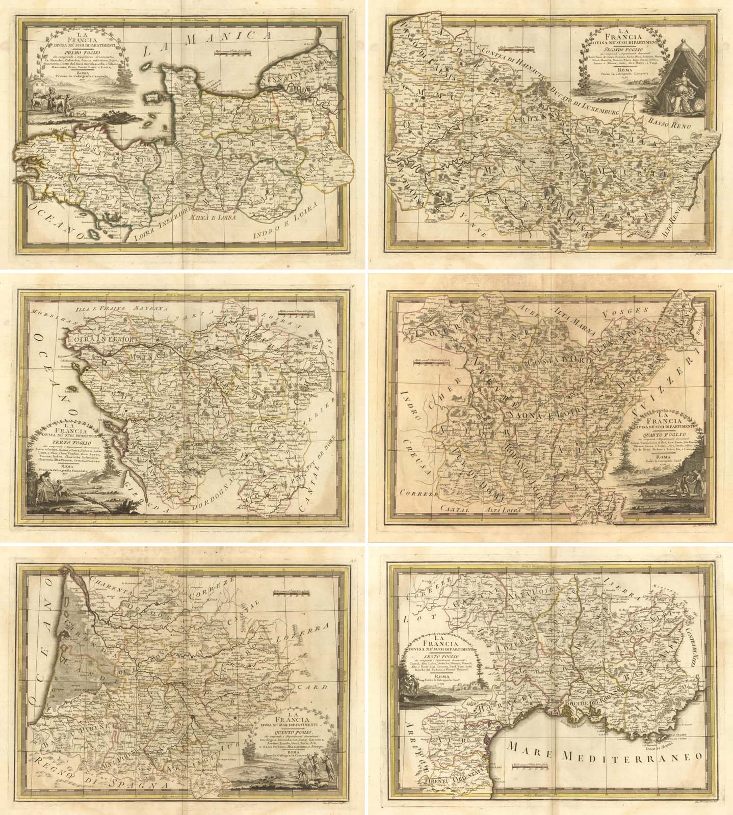 Carta geografica, in sei fogli, raffigurante la Francia ed i suoi dipartimenti. Nel primo foglio sono raffiguranti i dipartimenti Manche, Calvados, Senna inferiore, Eure, Finisterre, Coste del Nord, Morbihan, Illa e Vilanine, Maienna, Orne, Sarte e Loira. Nel secondo foglio Passo di Calais, Nord, Somma, Aisne, Oisa, Ardenne, Marna, Mosa, Mosella, Meurte, Basso Reno, Senna ed Oisa, Senna e Marna, Aube, Alta Marna e Vosgi. Nel terzo foglio Loria Inferiore, Maina e Loira, Indro e Loira, Loira e Cher, Cher, Vendee, Due Sevre, Vienna, Indro, Charenta Inferiore, Charenta, Alta Vienna, Creusa e Correze. Nel quarto foglio (leggermente brunito) Loiret, Yonne, Costa d'Oro, Alta Saona, Alto Reno, Nievre, Saona e Loira, Jura, Doubs, Allier, Puy de Dome, Rodano e Loira, Ain e Isera. Nel quinto foglio Dordogna, Gironda, Lot, Lot e Garonna, Aveiron, Lande, Gers, Tarn, Alti e Bassi Pirenei, Alta Garonna e Arriege. Nel sesto foglio Cantal, Alta Loira, Ardeche, Droma, Herault, Alte e basse Alpi, Lozerra, Gard, Varo, Aude, Bocche del Rodano,e Pirenei Orientali. L'incisione è caratterizzata da una gradevole acquerellatura confinale coeva.Alcune macchie nel margine che non compromettono il generale buono stato di conservazione. La carta si trova inserita nel secondo volume dell'opera "Nuovo Atlante Geografico Universale delineato sulle ultime osservazioni" pubblicato nel 1792, che venne commissionato al Cassini dalla Calcografia Camerale di Roma. Successivamente vennero pubblicati il secondo ed il terzo volume rispettivamente nel 1797 e nel 1801.