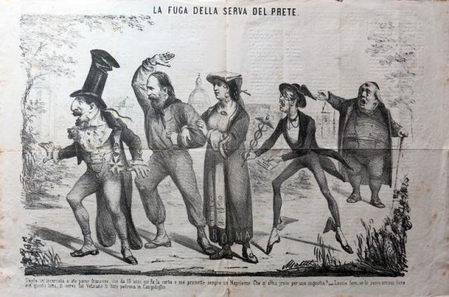 Agosto, 1862 – Anno V. Incisione su legno, b/n, cm 35 x 52,3 Si tratta di un foglio di giornale illustrato a doppia pagina con firma di Matat che ritrae Garibaldi in una ironica scena con personaggi romani e un ufficile francese.