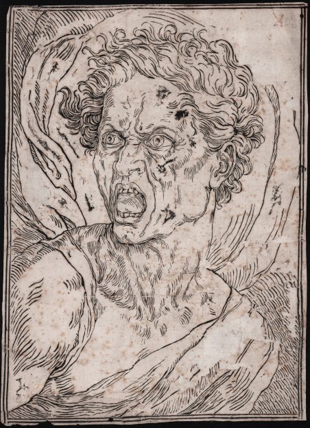 Xilografia, circa 1524/45, monogrammata in basso a sinistra. Derivazione, in controparte, dalla Furia (conosciuta anche come l’Anima dannata) di Michelangelo, un disegno a matita nera oggi conservato a Firenze [Gabinetto Disegni e Stampe degli Uffizi, inv. 601E]. L’opera non è censita in nessuno dei repertori sulle derivazioni a stampa da Michelangelo e in generale sembra essere sconosciuta alla vasta letteratura incisoria. Il disegno La Furia di Michelangelo venne realizzato intorno al 1520/24 e donato dall’artista all’amico Gherardo Perini: “Nell'edizione delle Vite del 1550, Vasari segnala il fiorentino Gherardo Perini tra gli amici ai quali Michelangelo aveva regalato alcuni suoi disegni, precisati nel 1568 «in tre carte alcune teste di matita nera divine», all'epoca già confluite nella raccolta granducale di Francesco de' Medici, il quale «le tiene per gioie, come le sono» (Vasari, ed. 1966-1987, VI, 1987, p. 113). L'inventario mediceo compilato tra il 1560 e il 1567 – Gherardo era morto nel 1564, lo stesso anno di Michelangelo segna uno dopo l'altro la cosiddetta Zenobia, le Tre teste e «uno dové un viso quasiche di furia» (Archivio di Stato di Firenze, Guardaroba Medicea, 65, fol. 164a). I tre fogli originali sono oggi rispettivamente riconosciuti in 598E, 599E, 601E del Gabinetto Disegni e Stampe degli Uffizi” (cfr. Alessia Alberti, La Furia in “D’après Michelangelo”, p. 39). L’interpretazione iconografica del volto urlante di Michelangelo è stata sempre complessa e problematica. Tuttavia, l’indicazione del Vasari che la inserisce in una serie di teste divine o imprecisate allegorie dantesche, sembra quella più indicata. La più tarda titolazione di Anima dannata è dovuta a Carlo Cesare Malvasia (1678) che definisce così una derivazione a stampa della scuola di Agostino Carracci. Il disegno della Furia conosce numerose derivazioni, tra le quali una matita rossa attribuita a Francesco Salviati (1510-1563), una pietra nera attribuita a Giorgio Vasari (1511-1574) e una a Alessandro Allori (1535-1607), altri 5 anonimi disegni databili tra la seconda metà del Cinquecento e l’inizio del Seicento, un dipinto attribuito a Pier Francesco Foschi (1502-1567), oggi conservato presso Casa Buonarroti a Firenze. Per una trattazione su disegni, dipinti e modelli si rimanda all’ampia scheda pubblicata in ' d’apres Michelangelo, opera citata in bibliografia. Anche se priva di data, questa sconosciuta xilografia appare essere la prima derivazione in ordine cronologico del disegno, precedente alla Testa virile urlante, un bulino stampato a Roma da Antonio Salamanca (Firenze, Gabinetto Disegni e Stampe degli Uffizi, inv. St. sc. 1328) che fino ad oggi era ritenuto tale e al HERACLITI EXCLAMATIO, un anonimo bulino fiammingo della seconda metà del ‘500 (Firenze, Gabinetto Disegni e Stampe degli Uffizi St. vol. 10165) noto per la sua ristampa curata da Paul de la Houve (1601) e probabilmente pubblicato per la prima volta dalla tipografia di Hieronymus Cook. La Furia venne utilizzata anche come modello per la testa di un disegno di Rosso Fiorentino, come vediamo nell’incisione Notomia secca o La Furia (circa 1524) di Giacomo Caraglio; tuttavia, il bulino di Caraglio non traduce fedelmente il disegno michelangiolesco. L’intaglio è attribuibile al fiorentino Lucantonio degli Uberti (notizie 1503-1557). In basso a sinistra, infatti, è presente una firma, espressa attraverso un monogramma composto da una “L” e altre (due?) lettere intrecciate. ' Sebbene Lucantonio firmasse sempre in maniera diversa, la lettera “L” è ben messa in evidenza nei suoi monogrammi. La xilografia, poi, sembra essere uno dei legni di un chiaroscuro, tecnica nella quale erano veramente pochi gli interpreti all’epoca, e del quale Lucantonio è noto per il Sabba delle streghe (1516), una derivazione di un’opera di Hans Baldung Grien, che firma con il monogramma “La” posto all’interno di un. UNDESCRIBED WORK Woodcut, circa 1524/45, monogrammed at lower left. Derivation, in counterpart, from Michelangelo's Fury (also known as the Damned Soul), a black pencil drawing now preserved in Florence [Gabinetto Disegni e Stampe degli Uffizi, inv. 601E]. The work is not surveyed in any of the repertories on printed derivations from Michelangelo and in general seems to be unknown to the vast engraving literature. The drawing The Fury of Michelangelo was made around 1520/24 and given by the artist to his friend Gherardo Perini: "In the 1550 edition of Le Vite, Vasari mentions the Florentine Gherardo Perini among the friends to whom Michelangelo had given some of his drawings, specified in 1568 “in tre carte alcune teste di matita nera divine” at the time already in the grand ducal collection of Francesco de' Medici, who “le tiene per gioie, come le sono” [holds them for joys, as they are (Vasari, ed. 1966-1987, VI, 1987, p. 113)]. The Medici inventory compiled between 1560 and 1567- Gherardo had died in 1564, the same year as Michelangelo - marks one after the other the so-called Zenobia, the Three Heads and “una dové un viso quasiche di furia” [the face of a fury, Archivio di Stato di Firenze, Guardaroba Medicea, 65, fol. 164a]. The three original sheets are now respectively recognized in 598E, 599E, 601E of the Gabinetto Disegni e Stampe degli Uffizi" (cfr. Alessia Alberti, ' La Furia ' in “D’après Michelangelo”, p. 39). The iconographic interpretation of Michelangelo's screaming face has always been complex and problematic. However, Vasari's indication, which places it in a series of divine heads or unspecified Dantean allegories, seems the most suitable. The later titling of Anima dannata (Damned Soul), is due to Carlo Cesare Malvasia (1678), who thus defines a printed derivation from the school of Agostino Carracci. The drawing of the Fury knows numerous derivations, including a red pencil attributed to Francesco Salviati (1510-1563), a black stone attri