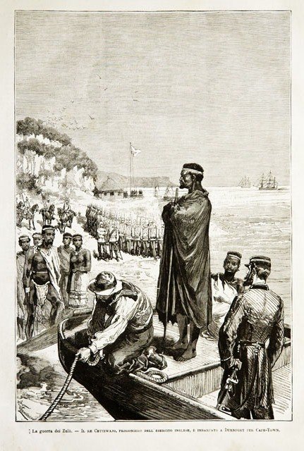 La guerra dei Zulù.- Il re Cettiwajo, prigioniero dell’esercito inglese, è imbarcato a Durnfort per Cape-Town