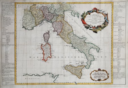 Carta della penisola con toponomastica e iscrizioni in spagnolo, che reca un misterioso imprint editoriale “En Londres”. La mappa deriva dalla rarissima carta di Pedro Gendron del 1755, a sua volta basata sul modello del geografo francese Guillaume de L’Isle. Questo l’esemplare della carta di Gendron conservato alla Biblioteca Nacional de Portugal. https://purl.pt/3745/3/ Sebbene le carte con l’imprint “En Londres” vengano comunemente attribuite allo stesso Pedro Gendron – si sostiene siano ristampe del rame originale con modifiche nei cartigli – un attento confronto tra le due carte, evidentemente molto simili, ci consente di escludere chiaramente questa attribuzione. Si tratta sicuramente di una carta stampata da altro rame - e non da un originale modificato - che riteniamo possa essere prodotto dalla tipografia del celebre cartografo spagnolo Tomas López de Vargas Machuca e probabilmente disegnata e stampata dal figlio Juan López de Vargas. Tomás López de Vargas Machuca (1730-1802) è stato un cartografo spagnolo attivo nell'ultima parte del XVIII secolo. Nato a Toledo, Vargas studiò matematica, grammatica e retorica al Colegio Imperial di Madrid. Nel 1752, con il patrocinio del marchese de la Ensenada, si trasferì a Parigi dove studiò cartografia sotto la guida del leggendario cartografo francese Jean Baptiste Bourguignon d'Anville (1697 - 1782). Al suo ritorno in Spagna, il re Carolos III lo nominò ' Geógrafo de los Dominios de Su Magestad ' e gli affidò la direzione del ' Gabinete de Geografía, appena creato. In questa posizione, dedicò il resto della sua vita a una dettagliata mappatura della Spagna, producendo numerose e importanti mappe regionali. Fu membro della Real Academia de San Fernando, della Real Sociedad Bascongada de Amigos del País e dell'Academia de Bellas Letras de Sevilla. A López succedettero i due figli, anch'essi cartografi, che pubblicarono diversi atlanti basati sul suo lavoro. Juan López de Vargas nacque a Madrid nel 1765. Studiò cartografia a Parigi e a Londra, inviato dal conte di Floridablanca. Lui e suo fratello Tomás Mauricio continuarono l'impresa fondata dal padre. Juan López fu anche cartografo del re e succedette al padre come direttore del Gabinetto geografico di Madrid. Come risulta dalla sua estesa bibliografia https://dbe.rah.es/biografias/19559/juan-lopez Juan López fu a Parigi e Londra tra il 1785 e il 1792, producendo anche alcune mappe: “Dopo dodici anni di attività come geografo, fu inviato dal conte di Floridablanca a Parigi e a Londra, con una pensione di 8.000 reali, per perfezionare le sue conoscenze e con l'idea di farlo diventare membro dell'Accademia delle Scienze. In segno di gratitudine, con una lettera da Parigi del 18 aprile 1788, Juan López gli inviò dodici copie della Mapa general de España Antigua. Si formò in quelle città per sette anni e gli ambasciatori spagnoli fecero buoni rapporti al re sulle sue prestazioni e sul suo lavoro. Tornò a Madrid nel 1792 e la pensione divenne uno stipendio fisso”. Crediamo, quindi, che questa mappa dell’Italia – e in generale quelle con l’imprint “En Londres” - sia stata realizzata da Juan López nel suo periodo londinese o, in alternativa, stampata al suo ritorno a Madrid. Acquaforte e bulino, circa 1785-92, coloritura coeva con ritocchi, tracce di pieghe di carta visibili al verso, per il resto in ottimo stato di conservazione. Opera rarissima. Bibliografia Hernando, Agustín, ' El Atlas geográfico de España (1804) producido por Tomás López, ' Madrid, Centro Nacional de Información Geográfica (Ministerio de Fomento), 2005; Hernando, Agustín, ' El geógrafo Juan López (1765-1825) y el comercio de mapas en España, Madrid, Consejo Superior de Investigaciones Científicas, Ediciones Doce Calles, 2008. Carta della penisola con toponomastica e iscrizioni in spagnolo, che reca un misterioso imprint editoriale “En Londres”. La mappa deriva dalla rarissima carta di Pedro Gendron del 1755, a sua volta basata sul modello del geografo francese Guillaume de L’Isle. Questo l’esemplare della carta di Gendron conservato alla Biblioteca Nacional de Portugal. https://purl.pt/3745/3/ Sebbene le carte con l’imprint “En Londres” vengano comunemente attribuite allo stesso Pedro Gendron – si sostiene siano ristampe del rame originale con modifiche nei cartigli – un attento confronto tra le due carte, evidentemente molto simili, ci consente di escludere chiaramente questa attribuzione. Si tratta sicuramente di una carta stampata da altro rame - e non da un originale modificato - che riteniamo possa essere prodotto dalla tipografia del celebre cartografo spagnolo Tomas López de Vargas Machuca e probabilmente disegnata e stampata dal figlio Juan López de Vargas. Tomás López de Vargas Machuca (1730-1802) è stato un cartografo spagnolo attivo nell'ultima parte del XVIII secolo. Nato a Toledo, Vargas studiò matematica, grammatica e retorica al Colegio Imperial di Madrid. Nel 1752, con il patrocinio del marchese de la Ensenada, si trasferì a Parigi dove studiò cartografia sotto la guida del leggendario cartografo francese Jean Baptiste Bourguignon d'Anville (1697 - 1782). Al suo ritorno in Spagna, il re Carolos III lo nominò ' Geógrafo de los Dominios de Su Magestad ' e gli affidò la direzione del ' Gabinete de Geografía, appena creato. In questa posizione, dedicò il resto della sua vita a una dettagliata mappatura della Spagna, producendo numerose e importanti mappe regionali. Fu membro della Real Academia de San Fernando, della Real Sociedad Bascongada de Amigos del País e dell'Academia de Bellas Letras de Sevilla. A López succedettero i due figli, anch'essi cartografi, che pubblicarono diversi atlanti basati sul suo lavoro. Juan López de Vargas nacque a Madrid nel 1765. Studiò cartografia a Parigi e a Londra, inviato dal conte di Floridablanca. Lui e suo fratello Tomás Mauricio continuarono l'impresa fondata dal padr