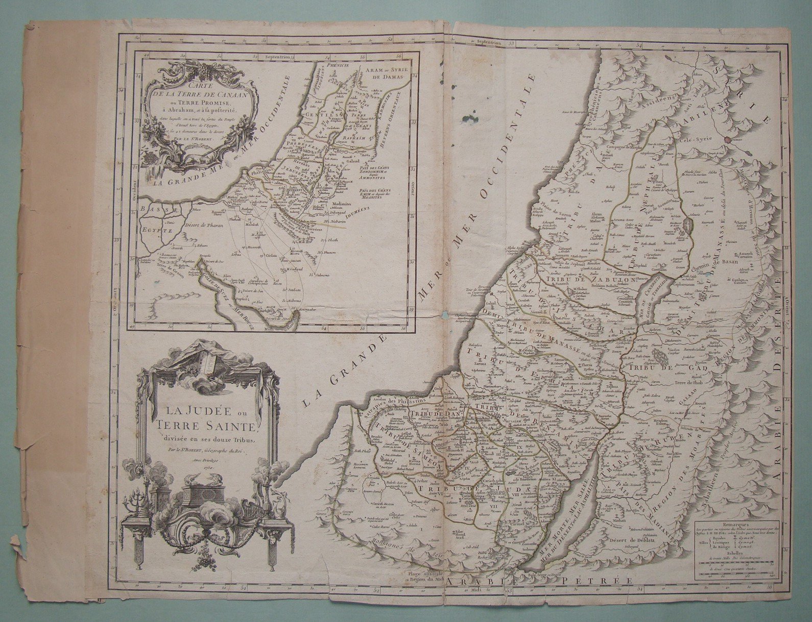 ROBERT. La Judee ou Terre Sainte divisée en ses douze tribus. 1750. Double page engraved map by Robert. Inches 19 x 23 1/2 (Cm. 48x59). Small tears.