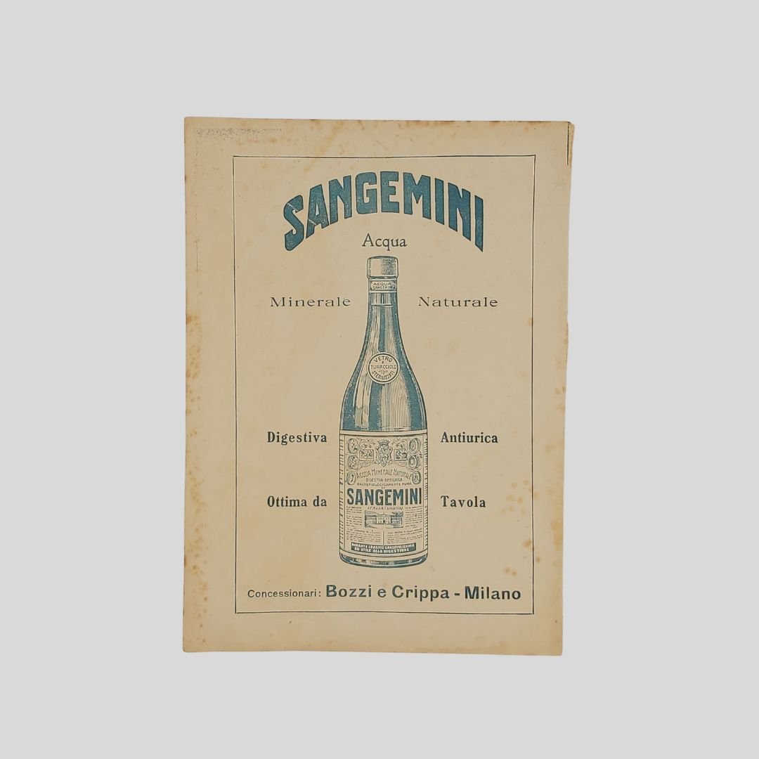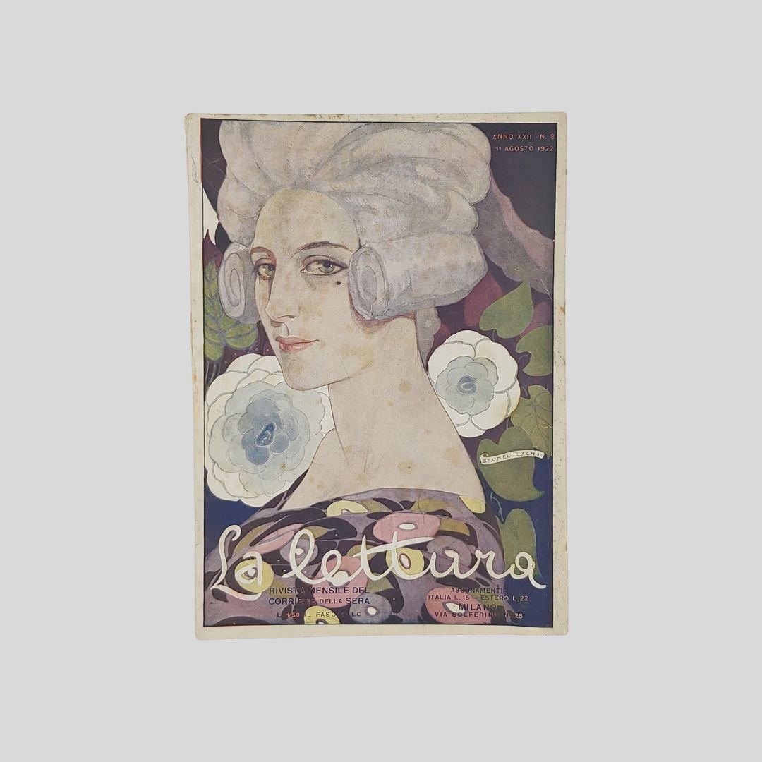 cm 17×24. Copertina liberty di Umberto Brunelleschi. Tratta dalla rivista “La Lettura”. Stampata al recto-verso. Alcune fioriture ai margini, ma in buone condizioni. Al verso pubblicità Acqua Sangemini