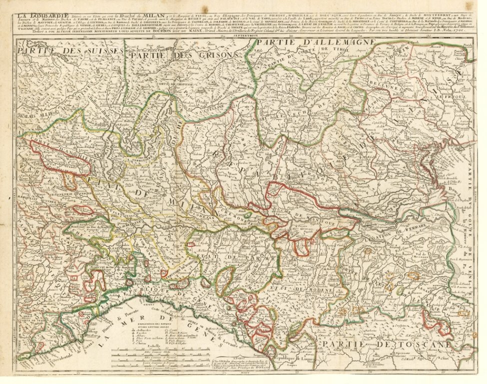 Interessante raffigurazione geografica dell'Italia settentrionale degli inizi del '700 che permette di apprezzare in modo dettagliato la suddivisione politica del territorio nei vari Stati, Ducati, Legazioni sino all'indicazione dei vari feudi sia Imperiali che della Chiesa, mentre non vengono indicati i percorsi stradali. Coloritura coeva dei confini. Margine destro ed inferiore ridotti, ma complessivamente buona conservazione. Pieghe editoriali. Riferimenti: Davoli, San Felici "Terre di Langobardia.", p. 84, n° 32