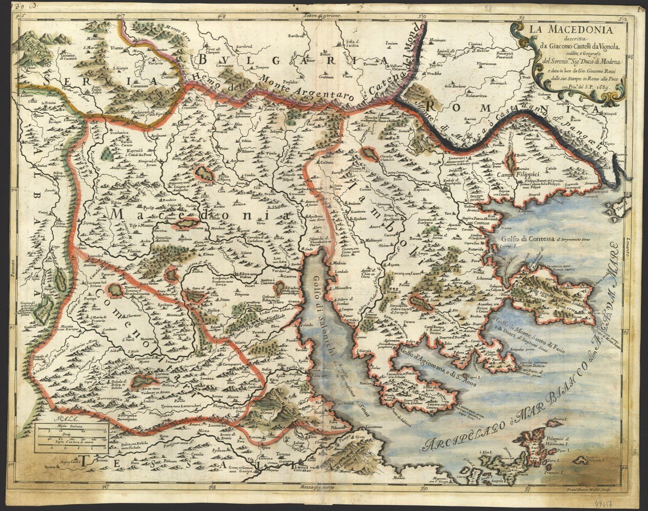 Carta geografica della Macedonia, in bella coloritura coeva. Inserita in "Mercurio geografico overo Guida Geografica in tutte le parti del Mondo conforme le Tavole Geografiche del Sansone Baudran de Cantelli Data in luce con direttione, e cura di Gio. Giacomo de Rossi nella sua stamperia in Roma alla Pace all'insegna di Parigi con Priu: del S. Pont" edita a Roma alla fine del '600. La carta presenta un restauro conservativo nel Golfo di Salonicco e due arrossature agli angoli in basso