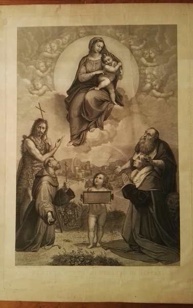 Bellissima incisione in acciaio, tratta da un dipinto di Raffaello. Stato discreto (sul retro presenza di due fasce di carta incolllate). Dimensioni dell'incisione: 50 x 60 cm.