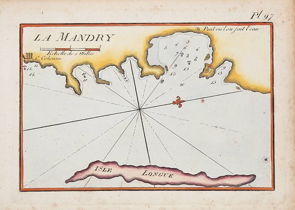 Piano nautico tratto dal " Recueil des principaux plans des ports & rades de la Méditerranée" di Josepgh Roux, pubblicato per la prima volta a Marsiglia nel 1764 e successivamente ristampato - ampliato - a Genova da Yves Gravier con il titolo "Recueil de 163 principaux plans des ports et rades de la Mediterranée" (1804).Ulteriore edizione dell'opera, con il titolo "Plans des ports ed des rades de la Mer Méditerranée." è stampata a Livorno da Carlo Tesi nel 1858. Incisione in rame, finemente acquarellata a mano, in ottimo stato di conservazione. First published in the "Recueil des principaux plans des ports et rades de la Mer Mediterranee", 1764, this nice nautical chart is taken from the rare "Plans des ports ed des rades de la Mer Méditerranée." published in Leghorn by Carlo Tesi, 1858. Copperplate with fine colouring, in very good condition. Cfr.