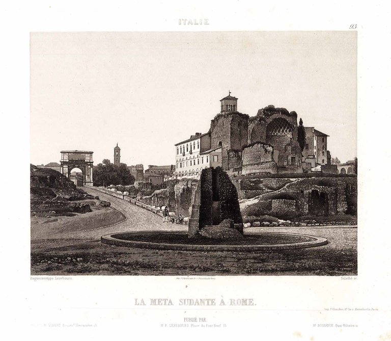 Stampa antica ed originale. della fontana di età flavia, che si trovava vicino al Colosseo e all'arco di Costantino. Inserita nell'opera "Excursions photographiques. Vues et monuments les plus remarquables de l'univers.". Parigi 1863. Autore: Salathé sculp. Luogo: Roma. Anno: 1863. Tecnica: acquatinta. Dimensioni: 270x370 il foglio.