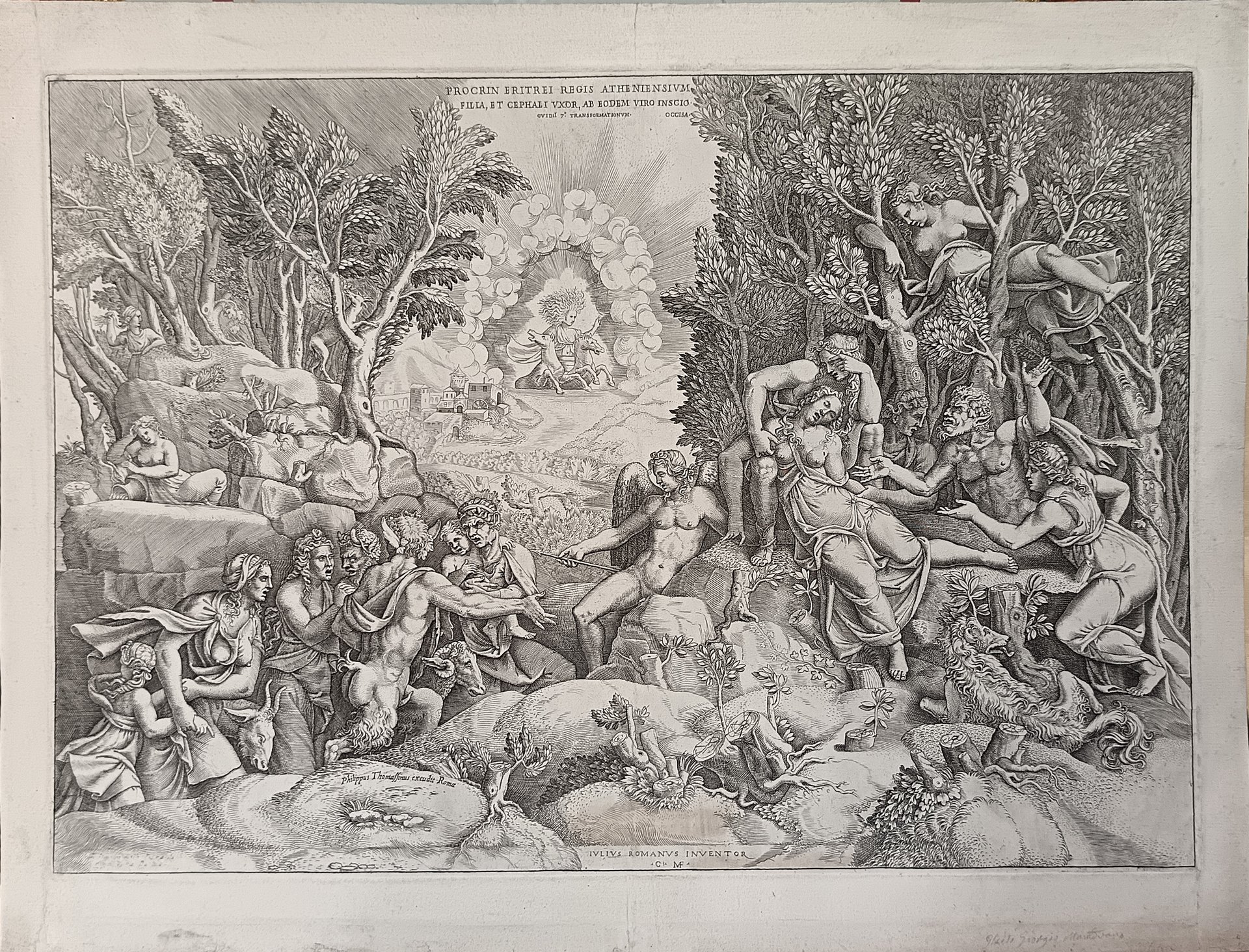 L'episodio è tratto dalle Metamorfosi di Ovidio (VII, 752-765). I due protagonisti sono rappresentati sulla destra: Cefalo piange sostenendo il cadavere di Procri attorniati da ninfe e satiri che assistono alla scena. Ai loro piedi il cane Lelapo. Al centro una figura alata mostra la freccia magica che ha causato la morte della giovane e dietro di questa, sullo sfondo oltre il profilo di una città, compare il carro dell'Aurora. Il soggetto deriva da un disegno della stessa dimensione di Giulio Romano databile al 1530 circa, oggi a Francoforte, Stadelsches Kunstinstitut. Il disegno, con altri tre di simile soggetto venatorio, doveva servire da modello per gli affreschi da realizzare nella reggia gonzaghesca di Marmirolo. Inciso in alto al centro: PROCRIN ERITREI REGIS ATHENIENSIVM/FILIA, ET CEPHALI VXOR, AB EODEM VIRO INSCIO/OCCISA/ OVIDII 7°. TRANSFORMATIONVM. In basso al centro: Philippus Thomassinus excudit Romae e IVLIVS ROMANVS INVENTOR/ GMF. A sinistra l'indirizzo di Gian Giacomo de Rossi è stato abraso. Esemplare nel VIII/X stato con l'indirizzo G.G de Rossi in Roma alla Pace inciso in basso a sinistra ma prima dell'aggiunta delle censure volute da Papa Leone XII. La lastra si trova presso la Calcografia Nazionale, Roma.