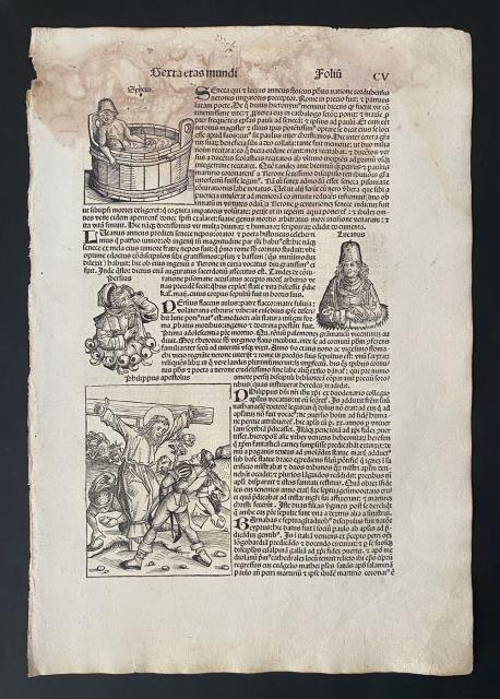 Dal “Liber Chronicarum Nurembergensi”, Norimberga, 1493. Foglio CV. Xilografie stampate su pagina singola, b/n, cm 32,5, x 47,5 circa (il foglio). Al recto le immagini di Seneca che si suicida nella vasca da bagno, l'immaginetta di Persius Aulus Flaccus (34 - 62 d. C.), poeta romano di origine etrusca, quella di Marcus Annaeus Lucanus (39 - 65 d. C.), poeta romano imparentato con Seneca e infine la scena con Filippo apostolo, uno dei dodici apostoli, crocifisso e lapidato; al verso Papa Lino (33 - 79 d. C.), Papa Anacleto (in carica dal 79 al 92 d. C.), Bartholomaeus apostulus, uno dei 12 apostoli, al quale, secondo la leggenda fu strappata la pelle dal corpo vivo, infine il vescovo Apollinaire di Ravenna. Foglio interessato da presenza rosso - violacea, il cosiddetto fungo rosso, ma al solo margine superiore, peraltro ben impresso e in buono stato di conservazione. .