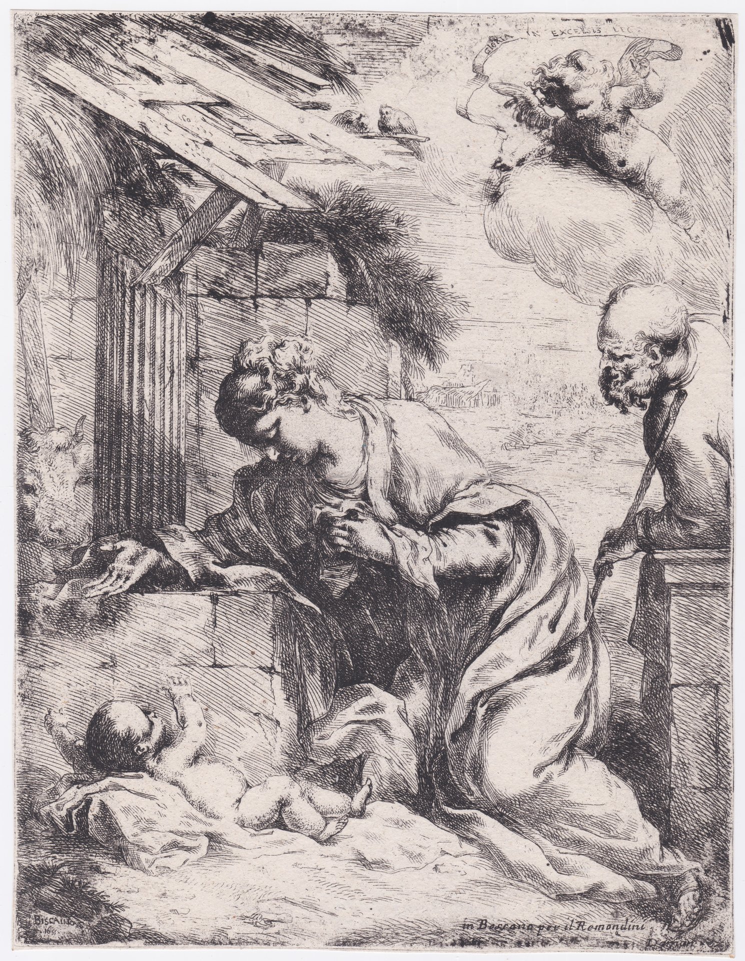 Il segno sciolto e graffiante, condotto per linee parallele che si alterna a incroci fitti nelle sole zone in ombra. La morsura via via più leggera man mano che si va verso la profondità della composizione crea un effetto sperimentale che si perde nelle tirature tarde. In basso a sinistra inciso "Biscainus f 1655", a destra "in Bassano per il Remondini" e "Daman. ex.". Sul cartiglio sorretto da un angelo in alto a destra si legge "Gloria in Excelsis Deo". Esemplare nel III/VII stato con l'indirizzo "in Bassano per il Remondini", si segnala che non si conoscono esemplari del I stato la cui esistenza è ipotizzata da Bartsh. Al verso timbro di collezione (Lught, L.982c), Frank Bensow (Göteborg 1883-1969), ufficiale e ingegnere civile, collezionista di stampe e qualche disegno.