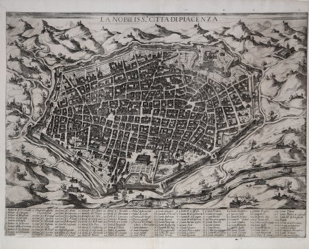 In alto al centro, sotto il bordo superiore, è inciso il titolo: LA NOBILISS.A CITTA DI PIACENZA. In basso a sinistra si trova l’imprint editoriale: Matteo florimi for. Lungo il bordo inferiore, disposta su dodici colonne, una legenda numerica composta da 118 rimandi. Pianta prospettica della città basata sul modello di Paolo Ponzoni (1572) come dimostra la presenza della legenda numerica di 118 rimandi, assente nella pianta edita da Orlandi. Scompare, tuttavia, la colonna che divideva i possedimenti dei domenicani di San Giovanni da quelli dei Templari, presente sia nel Ponzoni che nella sua prima copia. La pianta del Florimi, come dimostra anche il discreto numero di esemplari che oggi sono conosciuti, ebbe un buon successo editoriale e costituì il modello per le successive opere a stampa sulla città. L’ANTICHISSIMA E NOBILISSIMA CITTÀ DI PIACENZA di Paolo Ponzoni, viene alla luce nel 1571 dalla tipografia di Francesco Conti. Si tratta della “prima pianta prospettica a stampa a raffigurare completamente la città di Piacenza. Opera del piacentino Paolo Bolzoni (o Ponzoni), incisore e cartografo, è dedicata “alli suoi benigni et amorevoli piacentini”, e rappresenta il punto di riferimento obbligato per le successive piante della città sia del XVII che del XVIII secolo. Che le repliche successive non siano il risultato dell’analisi dello stato di fatto ma la rielaborazione del Ponzoni, è comprovato dalla ripetizione di alcuni particolari della pianta che, invece, dovevano essere corretti o aggiornati. È il caso di palazzo Farnese che, iniziato nel 1561, nella pianta del Ponzoni appare concluso, nonostante i lavori fossero in corso; nelle repliche è ancora raffigurato a corte chiusa, nonostante i lavori fossero stati interrotti nel 1604. Allo stesso modo, il torrazzo della Piazza, costruito nel 1339, sebbene sia stato abbassato nel 1607, nelle incisioni successive a questa data rimane ancora il segno distintivo della piazza. Della pianta si era persa ogni traccia fino al ritrovamento recente, nel 2012, dell’unico esemplare oggi noto. Già Leopoldo Cerri in “Cartografia piacentina del secolo XVI” ne lamenta la scomparsa e l’assenza di citazione nei cataloghi. Nel 1926 Emilio Nasalli Rocca considera come “pianta madre”, ignorando anche la stampa di Giovanni Orlandi, l’incisione di van Schoel. Ad un certo momento, un esemplare della pianta si ritrova nel Fondo di Emilio Malchiodi, che la conservava molto gelosamente. Nel 2000 un particolare della topografia appare sulla copertina della prima edizione de “La chiesa e il convento di San Giovanni in Canale” di Natalia Bianchini che ringrazia Malchiodi per averle concesso la fotoriproduzione del particolare. Tre anni dopo, un’altra notizia dell’esistenza dell’esemplare è pubblicata in “Piacenza incisa”: gli autori ottennero da Malchiodi il permesso di visionare la pianta ma non di fotografarla, neanche parzialmente. Infine, nel 2012, un esemplare – forse lo stesso del fondo Malchiodi – è venuto alla luce grazie alla generosità del collezionista privato che fieramente lo possiede e che ha voluto restituire ai piacentini la “pianta madre” della loro città, autorizzandone la riproduzione che è esposta nel complesso di Santa Margherita di Piacenza” (cfr. Cartografia e Topografia Italiana del XVI secolo p. 2304). Matteo Florimi (Polistena 1540 circa – Siena 1613) fu editore e commerciante di libri e di stampe. Di origini calabresi, si stabilì a Siena nel 1581, con un negozio in Banchi. L’attività calcografica di Matteo Florimi fu più volte affiancata da veri e propri maestri incisori come Cornelis Galle, Arnoldo degli Arnoldi, Pietro de Iode, Jan Sadeler e artisti come Francesco Vanni, Ventura Salimbeni e Alessandro Casolani, con i quali lo stampatore ha collaborato per la preparazione di soggetti sacri. L’attività cartografica del Florimi produsse stampe di moltissime città e territori di tutto il mon. In the upper center, below the top edge, is the engraved title: LA NOBILISS.A CITTA DI PIACENZA. At lower left is the editorial imprint: Matteo florimi for. Along the lower border, arranged in twelve columns, a numerical legend consisting of 118 key-references. Perspective plan of the city based on the model by Paolo Ponzoni (1572) as evidenced by the presence of the numerical legend of 118 key-references, absent in the map edited by Orlandi. Disappearing, however, is the column dividing the possessions of the Dominicans of San Giovanni from those of the Templars, present in both Ponzoni and his first copy. Florimi's map, as is also shown by the fair number of examples that are known today, was a good editorial success and was the model for later printed works on the city. Paolo Ponzoni's ANTICHISSIMA E NOBILISSIMA CITTÀ DI PIACENZA came to light in 1571 from the printing press of Francesco Conti. It is the “first printed perspective plan to completely depict the city of Piacenza. The work of the Piacenza-born Paolo Bolzoni (or Ponzoni), an engraver and cartographer, it is dedicated "al suoi benigni et amorevoli piacentini," and is the obligatory reference point for subsequent plans of the city in both the 17th and 18th centuries. That the later replicas are not the result of the analysis of the state of affairs but Ponzoni's reworking, is proven by the repetition of some details of the plan that, instead, had to be corrected or updated. This is the case with Palazzo Farnese, which, begun in 1561, appears to be finished in Ponzoni's plan, despite the fact that work was in progress; in the replicas it is still depicted with a closed court, despite the fact that work had been stopped in 1604. Similarly, the torrazzo of the Piazza, built in 1339, although it was lowered in 1607, in engravings after this date still remains the hallmark of the square. All trace of the plan had been lost until the recent discovery in 2012 of the only example known today” (see Cartografia e Topo