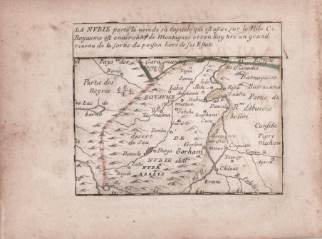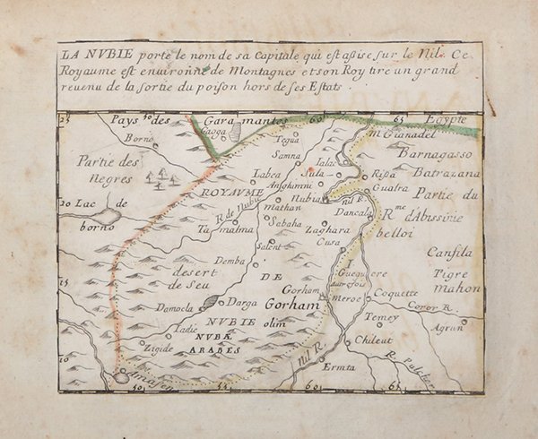 Acquaforte, 1656 circa, con coloritura coeva dei contorni, in buone condizioni.Esemplare del secondo stato di tre, con l’aggiunta dell’imprint di Jacques Lagniet e la data del 1661.La mappa proviene dal rarissimo foglio intitolato “L’Afrique Par le Sieur Du Val Geographe Ord. du Roy a Paris”, dal quale è stato ritagliato all’epoca - come anche certificato dalle antiche iscrizioni a inchiostro su alcune delle mappe - venendo applicato su un supporto di carta contemporanea, a formare un piccolo atlante in-sedicesimo oblungo.Secondo Philip Burden (che descrive l’analogo foglio sull’America) lo scopo di questa rara curiosità cartografica di Pierre Duval non è noto. Fa parte di un insieme di quattro tavole raffiguranti i continenti. Può essere datato, per motivi cartografici, all’incirca nel 1656. (cfr. Burden, The Mapping of North America, pagg. 417-418, n. 322).Richard Betz descrive 3 stati di questo foglio dell’Africa: senza la data, con l’indirizzo di Jacques Lagniet e la data del 1661, e uno successivo che presenta tracce di cancellazione del menzionato indirizzo.“This is an unusual map sheet by Pierre Duval depicting a map of the entire African continent and 14 reagional maps of Africa. […] This map of Africa is part of a set of four continent maps with regional maps procuded by Duval, all of which are scarce. […] Considering the small size of the map, Duval was able to supply a surprisngly high degree of detail to it. Duval used his unclu Nicolas Sanson’s 1650 map of Africa as his model, though in this map, Duval omits the lake in the Abyssinian highlands that was to eventually became Lake Tana, the source for the Blue Nile river. (cf. Betz, The Mapping of Africa, pp. 294, 295).Secondo Betz, l’unico esemplare del primo stato è conservato nella collezione della British Library, mentre sono note 3 copie del secondo stato (Bibliotheque National de France, McLaughlin Map Collection e nella collezione Antiquariat Haas - ora venduto). Etching, circa 1656, with contemporary outline colour, good condition.Example of the second state of three, with the imprint of Jacques Lagniet and the date 1661.The map comes from the very rare sheet entitled “L’Afrique Par le Sieur Du Val Geographe Ord. du Roy a Paris”, from which it was cut at the time and laid down on contemporary laid paper support, to form a small atlas, as certified by the ancient ink inscriptions on some of the maps.According with Philip Burden “The purpose of this rare curiosity by Pierre Duval is not known. It forms part of a set of the four known continents. It can be dated to apporximately 1656 […] The second state bears the additional imprint of Jacques Lagniet and the date 1661”. (cf. Burden, The Mapping of North America, pp. 417-418, n. 322). Richard Betz describes 3 states of this broadsheet: without the date, with the imprint of Jacques Lagniet and the date 1661, and with traces of erasure on his address. “This is an unusual map sheet by Pierre Duval depicting a map of the entire African continent and 14 reagional maps of Africa. […] This map of Africa is part of a set of four continent maps with regional maps procuded by Duval, all of which are scarce. […] Considering the small size of the map, Duval was able to supply a surprisngly high degree of detail to it. Duval used his unclu Nicolas Sanson’s 1650 map of Africa as his model, though in this map, Duval omits the lake in the Abyssinian highlands that was to eventually became Lake Tana, the source for the Blue Nile river. (cf. Betz, The Mapping of Africa, pp. 294, 295).According with Betz the only example of the first state of the broadsheet is preserved in the British Library collection, while 3 copies of the second state are known (Bibliotheque National de France, McLaughlin Map Collection and Bedburg-Hau, Antiquariat Haas – now sold). Cfr. Betz, The Mapping of Africa, pp. 294, 295, n. 85; cf. Burden, The Mapping of America, n. 322, II/II; cf. Pastoureau (1984) p. 136; cf. J. Hubbard, Japoniae Insulae. The Mapping of Japan, pp. 199-201, n. 28.