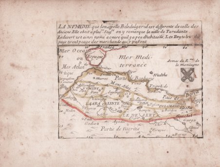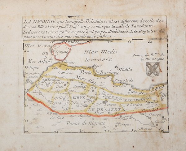 Acquaforte, 1656 circa, con coloritura coeva dei contorni, in buone condizioni.Esemplare del secondo stato di tre, con l’aggiunta dell’imprint di Jacques Lagniet e la data del 1661.La mappa proviene dal rarissimo foglio intitolato “L’Afrique Par le Sieur Du Val Geographe Ord. du Roy a Paris”, dal quale è stato ritagliato all’epoca - come anche certificato dalle antiche iscrizioni a inchiostro su alcune delle mappe - venendo applicato su un supporto di carta contemporanea, a formare un piccolo atlante in-sedicesimo oblungo.Secondo Philip Burden (che descrive l’analogo foglio sull’America) lo scopo di questa rara curiosità cartografica di Pierre Duval non è noto. Fa parte di un insieme di quattro tavole raffiguranti i continenti. Può essere datato, per motivi cartografici, all’incirca nel 1656. (cfr. Burden, The Mapping of North America, pagg. 417-418, n. 322).Richard Betz descrive 3 stati di questo foglio dell’Africa: senza la data, con l’indirizzo di Jacques Lagniet e la data del 1661, e uno successivo che presenta tracce di cancellazione del menzionato indirizzo.“This is an unusual map sheet by Pierre Duval depicting a map of the entire African continent and 14 reagional maps of Africa. […] This map of Africa is part of a set of four continent maps with regional maps procuded by Duval, all of which are scarce. […] Considering the small size of the map, Duval was able to supply a surprisngly high degree of detail to it. Duval used his unclu Nicolas Sanson’s 1650 map of Africa as his model, though in this map, Duval omits the lake in the Abyssinian highlands that was to eventually became Lake Tana, the source for the Blue Nile river. (cf. Betz, The Mapping of Africa, pp. 294, 295).Secondo Betz, l’unico esemplare del primo stato è conservato nella collezione della British Library, mentre sono note 3 copie del secondo stato (Bibliotheque National de France, McLaughlin Map Collection e nella collezione Antiquariat Haas - ora venduto). Etching, circa 1656, with contemporary outline colour, good condition.Example of the second state of three, with the imprint of Jacques Lagniet and the date 1661.The map comes from the very rare sheet entitled “L’Afrique Par le Sieur Du Val Geographe Ord. du Roy a Paris”, from which it was cut at the time and laid down on contemporary laid paper support, to form a small atlas, as certified by the ancient ink inscriptions on some of the maps.According with Philip Burden “The purpose of this rare curiosity by Pierre Duval is not known. It forms part of a set of the four known continents. It can be dated to apporximately 1656 […] The second state bears the additional imprint of Jacques Lagniet and the date 1661”. (cf. Burden, The Mapping of North America, pp. 417-418, n. 322). Richard Betz describes 3 states of this broadsheet: without the date, with the imprint of Jacques Lagniet and the date 1661, and with traces of erasure on his address. “This is an unusual map sheet by Pierre Duval depicting a map of the entire African continent and 14 reagional maps of Africa. […] This map of Africa is part of a set of four continent maps with regional maps procuded by Duval, all of which are scarce. […] Considering the small size of the map, Duval was able to supply a surprisngly high degree of detail to it. Duval used his unclu Nicolas Sanson’s 1650 map of Africa as his model, though in this map, Duval omits the lake in the Abyssinian highlands that was to eventually became Lake Tana, the source for the Blue Nile river. (cf. Betz, The Mapping of Africa, pp. 294, 295).According with Betz the only example of the first state of the broadsheet is preserved in the British Library collection, while 3 copies of the second state are known (Bibliotheque National de France, McLaughlin Map Collection and Bedburg-Hau, Antiquariat Haas – now sold). Cfr. Betz, The Mapping of Africa, pp. 294, 295, n. 85; cf. Burden, The Mapping of America, n. 322, II/II; cf. Pastoureau (1984) p. 136; cf. J. Hubbard, Japoniae Insulae. The Mapping of Japan, pp. 199-201, n. 28.