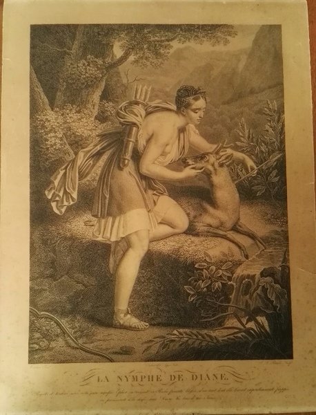 Bellissima incisione rappresentante Diana. Potrelle Sculpt. Schroeder Aqua Forti. Noerblin Pinx. Stato di conservazione abbastanza buono.Dimensioni: 45 cm x 59.