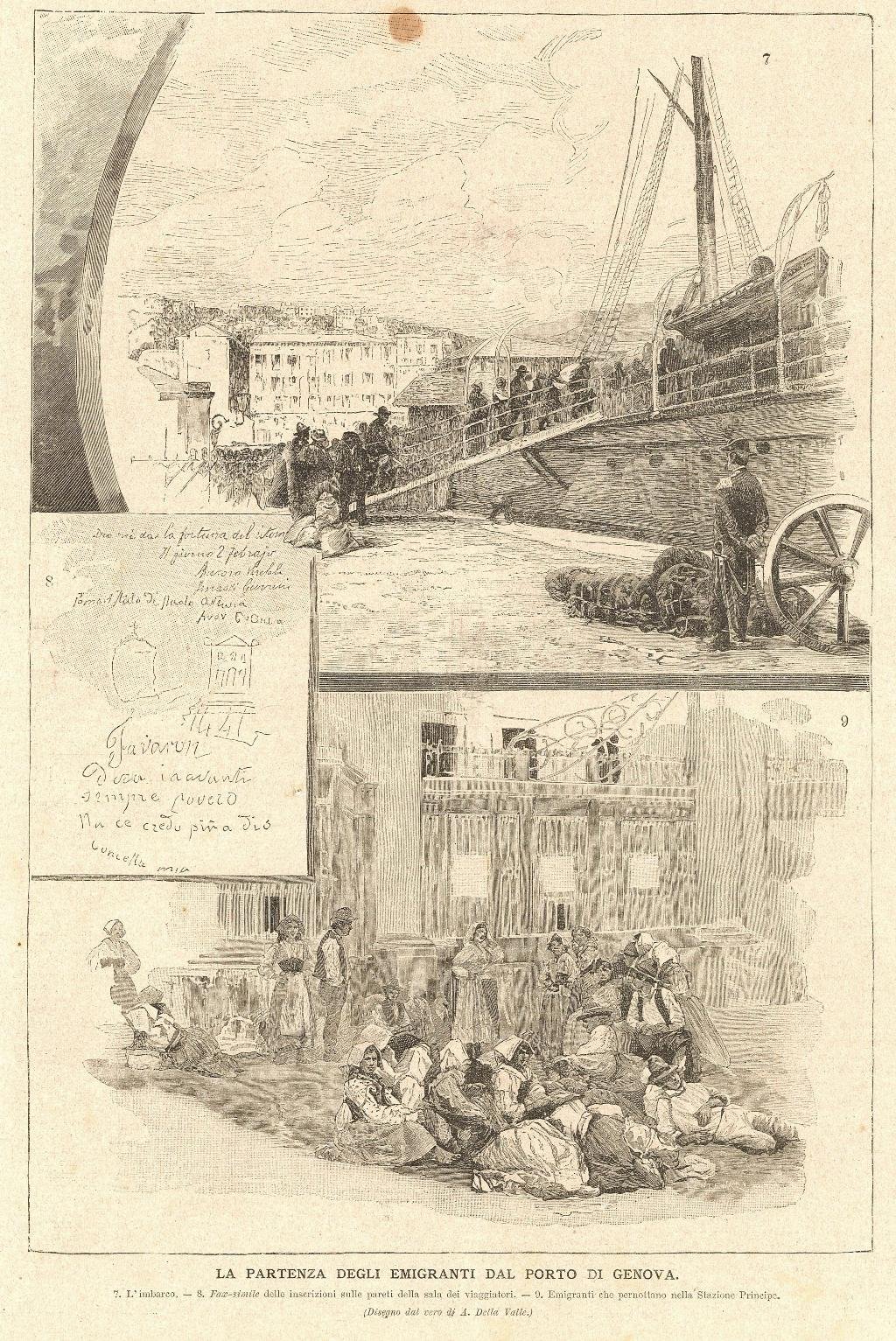 Stampa, antica ed originale, con raffigurazione di vignette raffiguranti la partenza di emigranti dal porto di Genova. Autore: Centenari. Luogo: Genova. Anno: 1890. Tecnica: xilografia. Dimensioni: 345x234. Testo al verso.