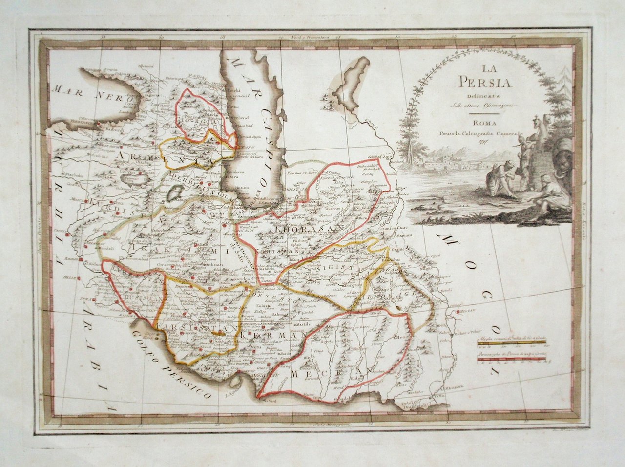 Incisione in rame di mm 365x495, con coloritura d'epoca dei confini. Bel cartiglio figurato in alto a destra. Bell'esemplare, assai marginoso, che illustra i territori dell'Iran, Armenia, Arzebaijan e Georgia. <BR><BR>