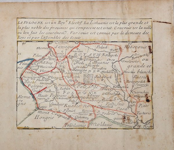 Acquaforte, 1656 circa, con coloritura coeva dei contorni, in buone condizioni.Esemplare del secondo stato di due, con l’imprint di Jacques Lagniet e la data del 1661.La mappa proviene dal rarissimo foglio intitolato “L’Europe par P. Du Val Geographe du Roy”, dal quale è stato ritagliato all’epoca - come anche certificato dalle antiche iscrizioni a inchiostro su alcune delle mappe - venendo applicato su un supporto di carta contemporanea, a formare un piccolo atlante in-sedicesimo oblungo.Non abbiamo trovato bibliografia su questo foglio d’Europa, pertanto ci riferiamo alla scarsa letteratura sui fogli che rappresentano gli altri continenti.Secondo Philip Burden (che descrive la carta dell’America), lo scopo di questa rara curiosità cartografica di Pierre Duval non è noto. Fa parte di un insieme di quattro tavole raffiguranti i continenti. Può essere datato, per motivi cartografici, all’incirca nel 1656. Burden descrive un solo esemplare di primo stato e due prove con l’indirizzo di Lagniet.La mappa dell'Asia è stata recentemente descritta da Jason Hubbard, che elenca un solo esemplare di primo stato e 5 di secondo (cfr. Japoniae Insulae, The Mapping of Japan, p. 201).Richard Betz descrive 3 stati del foglio dell’Africa: senza la data, con l’imprint di Jacques Lagniet e la data del 1661, e con tracce di cancellazione sui suoi indirizzi (cfr Betz, The Mapping of Africa, pp. 294, 295). Elenca un solo esemplare di primo stato, tre copie di quello stampato da Lagniet e tre del foglio con l’indirizzo abraso. Di un secondo stato del foglio del continente europeo, siamo stati di censire solo l’esemplare conservato presso la Bibliotheque National de France, unica istituzione che vanta nella propria raccolta tutti e quattro i fogli dei continenti di Pierre Duval e Jacques Lagniet. Etching, circa 1656, with contemporary outline colour, good condition.Example of the second state, with the imprint of Jacques Lagniet and the date 1661.The map comes from the very rare sheet entitled “L’Europe Par le Sieur Du Val Geographe Ord. du Roy”, from which it was cut at the time and laid down on contemporary laid paper support, to form a small atlas, as certified by the ancient ink inscriptions on some of the maps.We have not found bibliography on this sheet of Europe, we therefore refer to the scarce literature on the sheets representing the other continents.According with Philip Burden “The purpose of this rare curiosity by Pierre Duval is not known. It forms part of a set of the four known continents. It can be dated to apporximately 1656 […] The second state bears the additional imprint of Jacques Lagniet and the date 1661” (cf. Burden, The Mapping of North America, pp. 417-418, n. 322). The map of Asia is recently described by Jason Hubbard: “This miniature map of Japan is on a sheet of maps of Asia. Besides the map of the Asian continent there are 17 detailed maps including Turkey, the Holy Land, Georgia and Arabia. […] This map was issued as a loose sheet of Asia maps; similar maps are known for Africa, America and Europe” (cf. Japoniae Insulae, The Mapping of Japan, p. 201).Richard Betz describes 3 states of the broadsheet of Africa: without the date, with the imprint of Jacques Lagniet and the date 1661, and with traces of erasure on his addres (cf. Betz, The Mapping of Africa, pp. 294, 295). According Hubbard the third state of the map of Asia is only an assumption.Of a second state of the broadsheet of Europe, we are able to find only the example at the Bibliotheque National de France. Cfr. cf. J. Hubbard, Japoniae Insulae. The Mapping of Japan, pp. 199-201, n. 28; cf. Burden, The Mapping of America, n. 322, II/II; cf. Pastoureau (1984) p. 136; cf. Betz, The Mapping of Africa, pp. 294, 295, n. 85.