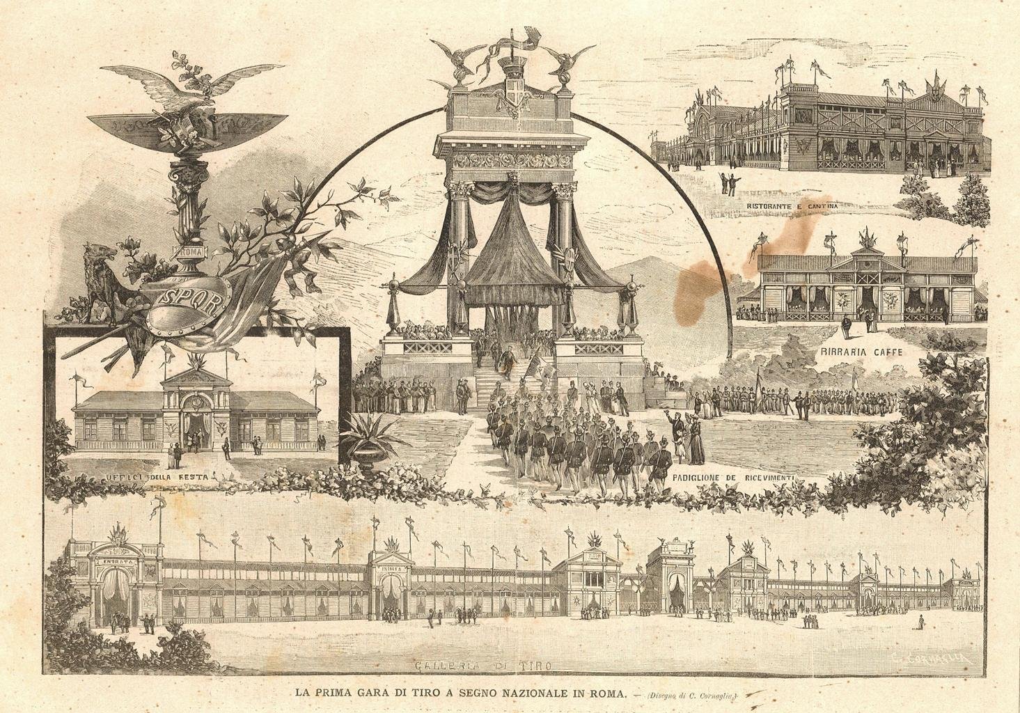 Stampa, antica ed originale, con raffigurazione piccole vedute in unico foglio raffiguranti i vari edifici dell'esposizione. Testo al verso. Autore: Cornaglia C. dis. Luogo: Roma. Anno: 1890. Tecnica: xilografia. Dimensioni: 237x348.