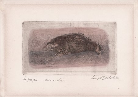 Acquaforte, 1932, esemplare unico terminato ad acquarello. Lastra 130x220 mm. Firmata e datata in lastra 1932. Titolo autografo a matita in basso a sinistra dove riportata l’iscrizione “unica a colori”. Firma a matita in basso a destra “Luigi Bartolini”. Un esemplare unico della stampa viene descritto in diversi repertori (vedi bibliografia sotto) e riprodotto ne Gli esemplari unici o rari (Casini editore, Roma 1952). Il presente esemplare sarebbe dunque l’unico terminato a colori da Bartolini. Luigi Bartolini è considerato uno dei maggiori incisori italiani del Novecento, insieme a Giorgio Morandi e Giuseppe Viviani. Oltre ad essere un prolifico incisore (al suo attivo oltre mille acqueforti), fu anche pittore e scrittore. Partecipò sia come pittore che come incisore a diverse edizioni della Biennale di Venezia dal 1928 al 1962. Presente a varie manifestazioni artistiche, sviluppò diverse maniere definite: ‘maniera bionda’, ‘lineare’ e ‘nera’. Ricordiamo soprattutto le acqueforti della serie Marche e della serie Sicilia. ' Iniziò la sua produzione grafica nel 1914 e il suo stile si rifà alla tradizione naturalistica dell’Ottocento. Molte sue incisioni si possono ricollegare ad alcune opere del Goya, di Telemaco Signorini e di Giovanni Fattori. Eccellente nella rappresentazione della natura morta e del paesaggio, spesso il Bartolini rappresentò dolcemente le cose e gli oggetti più umili, i soggetti di natura più dimessi. In essi ritroviamo il sentimento che diviene immagine e la forma che si sviluppa in espressione. Con Bartolini l’incisione torna ad essere un mezzo di espressione poetica libera dal simbolismo e dal vedutismo allora in voga presso le accademie. Nelle sue acqueforti prevale ora un tratteggio leggero (genere biondo), ora una ricerca del chiaroscuro alla Rembrandt (genere nero). Magnifica prova, con margini, in ottime condizioni. Il presente esemplare proviene dalla mostra di Bartolini presso la Galleria d’Arte Moderna Viotti di Torino, tenutasi il 22 febbraio 1969. Viene allegata la targhetta della galleria. Etching, 1932, unique example finished in watercolor. ' 130x220 mm plate. Signed and dated on plate 1932. Autograph title in pencil at lower left where inscribed "unique in color". Signature in pencil at lower right "Luigi Bartolini". A unique example of the print is described in several repertories and is reproduced in ' (Casini editore, Roma 1952). ' The present example would therefore be the only one finished in color by Bartolini. Magnificent proof, with margins, in excellent condition. The present example comes from Bartolini's exhibition at the Galleria d'Arte Moderna Viotti in Turin, on February 22, 1969. The gallery plaque is enclosed. Born in Cupramontana near Ancona, Luigi Bartolini was the twentieth century Italian etcher, who came closest to the stature of his great rival, Morandi. As a teenager, he saw the collection of etchings, including work by Callot, owned by the Corradi family in Iesi. From 1907 to 1910 Bartolini ' studied at the Istituto di Belle Arti in Siena, and started to etch c. 1909. He moved to Rome in 1910, where until 1912 he frequented the Accademia di Belle Arti, while also attending lectures on literature and the history of art, and courses on anatomy at the University in Rome. Bartolini studied the etchings of Goya and took lessons on drawing at the Accademia di Spagna. From there, he went to Florence in 1913, where he attended the Scuola del nudo. Bartolini continued his anatomical research, as well as studying architecture, making himself the most assiduous student of all Italian twentieth century printmakers. He also visited the Uffizi and Florentine print dealers to look at the etchings of Rembrandt and Fattori. Bartolini painted his first oils just before the outbreak of the First World War. Although he painted pictures throughout the rest of his career, and was awarded the Premio Marzotto for them in 1956, they have been far eclipsed in fame by his etchings and writings. During the First World War, Bartolini published his first collection of poetry. A very prolific and accomplished writer, in this field he is best known today as the author of the novel, 'Ladri di biciclette' (Bicycle thieves), of 1946, which was quickly turned into a celebrated film by Vittorio de Sica and Cesar Zavattini. After the First World War, Bartolini held a series of minor teaching posts in Macerata, Sassari, Avezzano, Pola, and Caltagirone, while he continued to etch, and started a long career as a polemical journalist and critic of art and architecture. From 1923 to 1929, he wrote for the Naples periodical, 'Cimento', but he also contributed to 'Il Selvaggio', 'Quadrivio', 'Italia letteraria', and 'L'Ambrosiana'. Bartolini's 1924 exhibition of etchings at the Casa d'Arte Bragaglia in Rome was a great success, and later that year he showed 70 etched landscapes of the Marches at the Casa Palazzo di Roma. The following year he visited Paris, where he paid particular attention to the paintings of Van Gogh. Bartolini's political convictions led him to being assaulted by Fascists and hospitalised in 1928. Two years later, he won a prize at the Venice Biennale, where he had exhibited a portfolio of etchings. In 1930, the Turin publisher, Buratti, began to issue a series of portfolios of etchings by contemporary Italian artists under the editorship of Cipriano Oppi, selecting Bartolini for the first album. The following year, Buratti published 'Le carte parlanti', a portfolio of 10 of Bartolini's etchings, which was published in an edition of 20. In 1932, Bartolini shared the first prize at the Prima mostra dell'incisione moderna at the Uffizi with Morandi and Boccioni. His close friend, the leading anti-Fascist art historian, Lionello Venturi, acted as his agent selling his etchings in Paris. Bartolini's correspondence with his compatriots in exile led to his imprisonment, from which he was released on Mussolini's personal